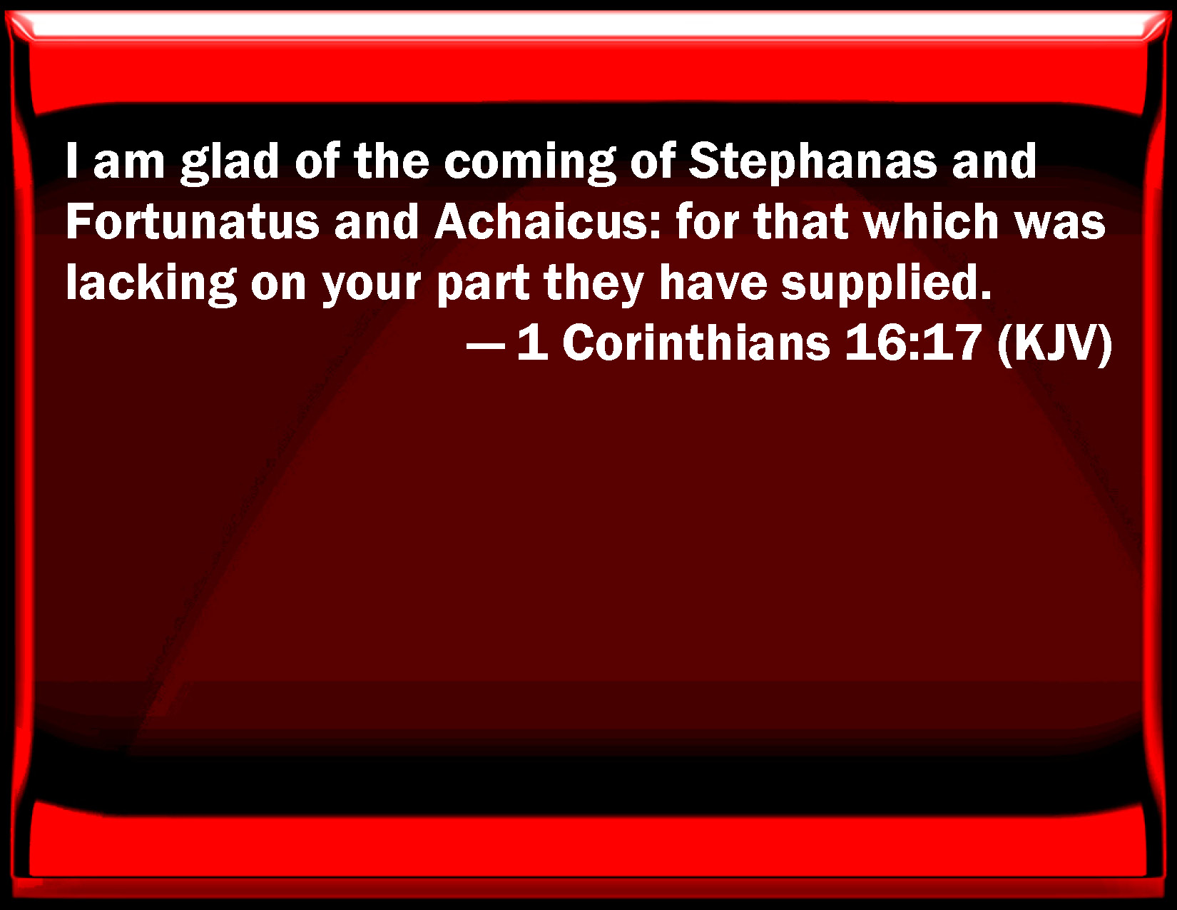 Bible Verse Slide 1 Corinthians 16:17 I am glad of the coming of Stephanas and Fortunatus and Achaicus: for that which was lacking on your part they have supplied. KJV: I am glad of the coming of Stephanas and Fortunatus and Achaicus: for that which was lacking on your part they have supplied. DRB: And I rejoice in the presence of Stephanas, and Fortunatus, and Achaicus, because that which was wanting on your part, they have supplied. DBT: But I rejoice in the coming of Stephanas and Fortunatus and Achaicus; because they have supplied what was lacking on your part. ERV: And I rejoice at the coming of Stephanas and Fortunatus and Achaicus: for that which was lacking on your part they supplied. WBT: I am glad of the coming of Stephanas, and Fortunatus, and Achaicus: for that which was lacking on your part, they have supplied. WEB: I rejoice at the coming of Stephanas, Fortunatus, and Achaicus; for that which was lacking on your part, they supplied. YLT: and I rejoice over the presence of Stephanas, and Fortunatus, and Achaicus, because the lack of you did these fill up;Links 1 Corinthians 16:17 NIV • 1 Corinthians 16:17 NLT • 1 Corinthians 16:17 ESV • 1 Corinthians 16:17 NASB • 1 Corinthians 16:17 KJV • 1 Corinthians 16:17 Interlinear • 1 Corinthians 16:17 Commentaries • 1 Corinthians 16:17 Parallel Texts • 1 Corinthians 16:17 Bible Apps • 1 Corinthians 16:17 Parallel • Bible Hub |