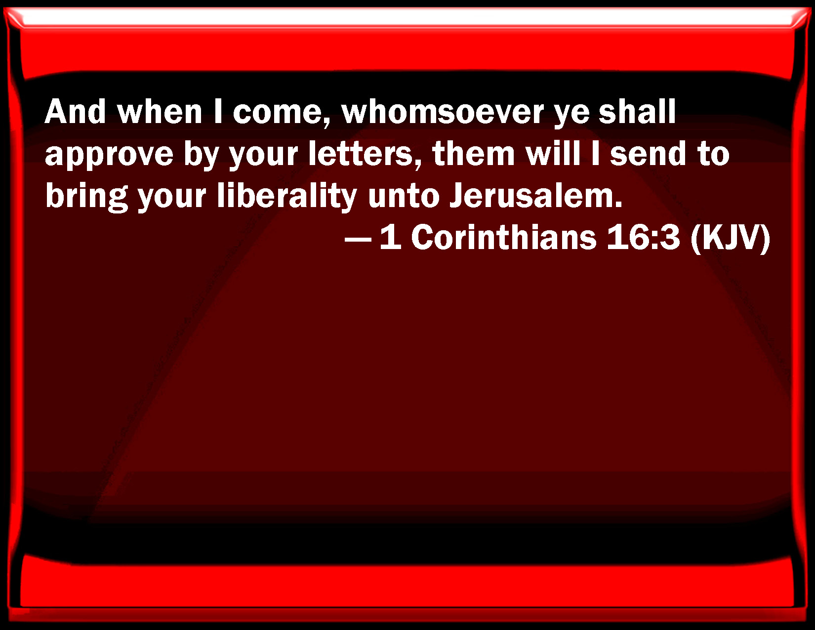 Bible Verse Slide 1 Corinthians 16:3 And when I come, whomsoever you shall approve by your letters, them will I send to bring your liberality to Jerusalem. KJV: And when I come, whomsoever ye shall approve by your letters, them will I send to bring your liberality unto Jerusalem. DRB: And when I shall be with you, whomsoever you shall approve by letters, them will I send to carry your grace to Jerusalem. DBT: And when I am arrived, whomsoever ye shall approve, these I will send with letters to carry your bounty to Jerusalem: ERV: And when I arrive, whomsoever ye shall approve by letters, them will I send to carry your bounty unto Jerusalem: WBT: And when I come, whomsoever ye shall approve by your letters, them will I send to bring your liberality to Jerusalem. WEB: When I arrive, I will send whoever you approve with letters to carry your gracious gift to Jerusalem. YLT: and whenever I may come, whomsoever ye may approve, through letters, these I will send to carry your favour to Jerusalem;Links 1 Corinthians 16:3 NIV • 1 Corinthians 16:3 NLT • 1 Corinthians 16:3 ESV • 1 Corinthians 16:3 NASB • 1 Corinthians 16:3 KJV • 1 Corinthians 16:3 Interlinear • 1 Corinthians 16:3 Commentaries • 1 Corinthians 16:3 Parallel Texts • 1 Corinthians 16:3 Bible Apps • 1 Corinthians 16:3 Parallel • Bible Hub |