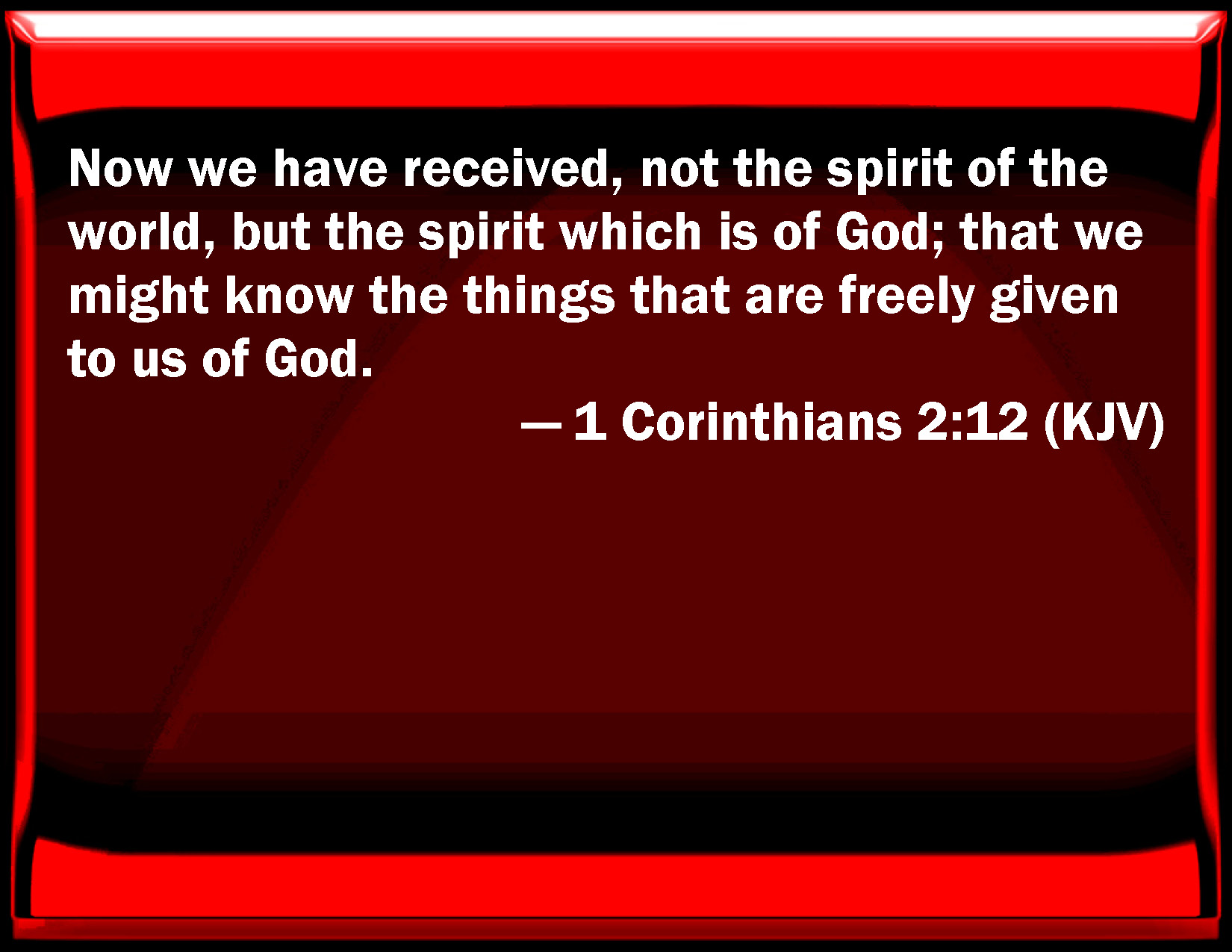 Bible Verse Slide 1 Corinthians 2:12 Now we have received, not the spirit of the world, but the spirit which is of God; that we might know the things that are freely given to us of God. KJV: Now we have received, not the spirit of the world, but the spirit which is of God; that we might know the things that are freely given to us of God. DRB: Now we have received not the spirit of this world, but the Spirit that is of God; that we may know the things that are given us from God. DBT: But we have received, not the spirit of the world, but the Spirit which is of God, that we may know the things which have been freely given to us of God: ERV: But we received, not the spirit of the world, but the spirit which is of God; that we might know the things that are freely given to us by God. WBT: Now we have received, not the spirit of the world, but the spirit which is from God; that we may know the things that are freely given to us by God. WEB: But we received, not the spirit of the world, but the Spirit which is from God, that we might know the things that were freely given to us by God. YLT: And we the spirit of the world did not receive, but the Spirit that is of God, that we may know the things conferred by God on us,Links 1 Corinthians 2:12 NIV • 1 Corinthians 2:12 NLT • 1 Corinthians 2:12 ESV • 1 Corinthians 2:12 NASB • 1 Corinthians 2:12 KJV • 1 Corinthians 2:12 Interlinear • 1 Corinthians 2:12 Commentaries • 1 Corinthians 2:12 Parallel Texts • 1 Corinthians 2:12 Bible Apps • 1 Corinthians 2:12 Parallel • Bible Hub |