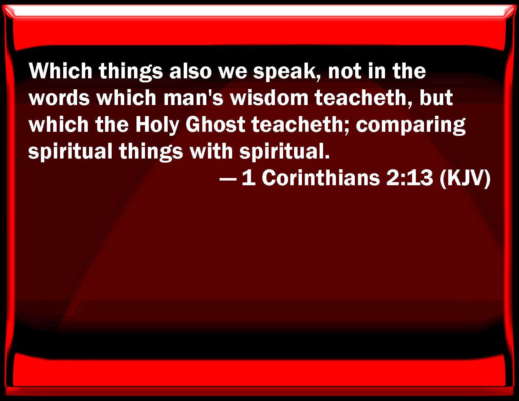 Bible Verse Slide 1 Corinthians 2:13 Which things also we speak, not in the words which man's wisdom teaches, but which the Holy Ghost teaches; comparing spiritual things with spiritual. KJV: Which things also we speak, not in the words which man's wisdom teacheth, but which the Holy Ghost teacheth; comparing spiritual things with spiritual. DRB: Which things also we speak, not in the learned words of human wisdom; but in the doctrine of the Spirit, comparing spiritual things with spiritual. DBT: which also we speak, not in words taught by human wisdom, but in those taught by the Spirit, communicating spiritual things by spiritual means. ERV: Which things also we speak, not in words which man's wisdom teacheth, but which the Spirit teacheth; comparing spiritual things with spiritual. WBT: Which things also we speak, not in the words which man's wisdom teacheth, but which the Holy Spirit teacheth; comparing spiritual things with spiritual. WEB: Which things also we speak, not in words which man's wisdom teaches, but which the Holy Spirit teaches, comparing spiritual things with spiritual things. YLT: which things also we speak, not in words taught by human wisdom, but in those taught by the Holy Spirit, with spiritual things spiritual things comparing,Links 1 Corinthians 2:13 NIV • 1 Corinthians 2:13 NLT • 1 Corinthians 2:13 ESV • 1 Corinthians 2:13 NASB • 1 Corinthians 2:13 KJV • 1 Corinthians 2:13 Interlinear • 1 Corinthians 2:13 Commentaries • 1 Corinthians 2:13 Parallel Texts • 1 Corinthians 2:13 Bible Apps • 1 Corinthians 2:13 Parallel • Bible Hub |