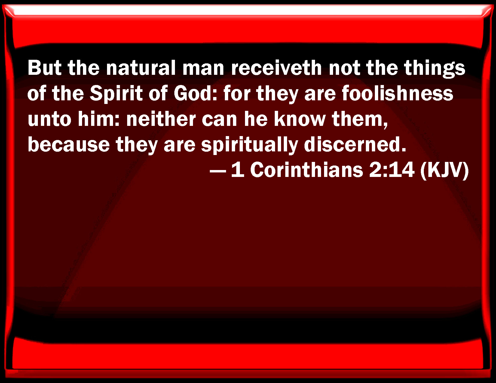 Bible Verse Slide 1 Corinthians 2:14 But the natural man receives not the things of the Spirit of God: for they are foolishness to him: neither can he know them, because they are spiritually discerned. KJV: But the natural man receiveth not the things of the Spirit of God: for they are foolishness unto him: neither can he know them, because they are spiritually discerned. DRB: But the sensual man perceiveth not these things that are of the Spirit of God; for it is foolishness to him, and he cannot understand, because it is spiritually examined. DBT: But the natural man does not receive the things of the Spirit of God, for they are folly to him; and he cannot know them because they are spiritually discerned; ERV: Now the natural man receiveth not the things of the Spirit of God: for they are foolishness unto him; and he cannot know them, because they are spiritually judged. WBT: But the natural man receiveth not the things of the Spirit of God: for they are foolishness to him: neither can he know them, because they are spiritually discerned. WEB: Now the natural man doesn't receive the things of God's Spirit, for they are foolishness to him, and he can't know them, because they are spiritually discerned. YLT: and the natural man doth not receive the things of the Spirit of God, for to him they are foolishness, and he is not able to know them, because spiritually they are discerned;Links 1 Corinthians 2:14 NIV • 1 Corinthians 2:14 NLT • 1 Corinthians 2:14 ESV • 1 Corinthians 2:14 NASB • 1 Corinthians 2:14 KJV • 1 Corinthians 2:14 Interlinear • 1 Corinthians 2:14 Commentaries • 1 Corinthians 2:14 Parallel Texts • 1 Corinthians 2:14 Bible Apps • 1 Corinthians 2:14 Parallel • Bible Hub |