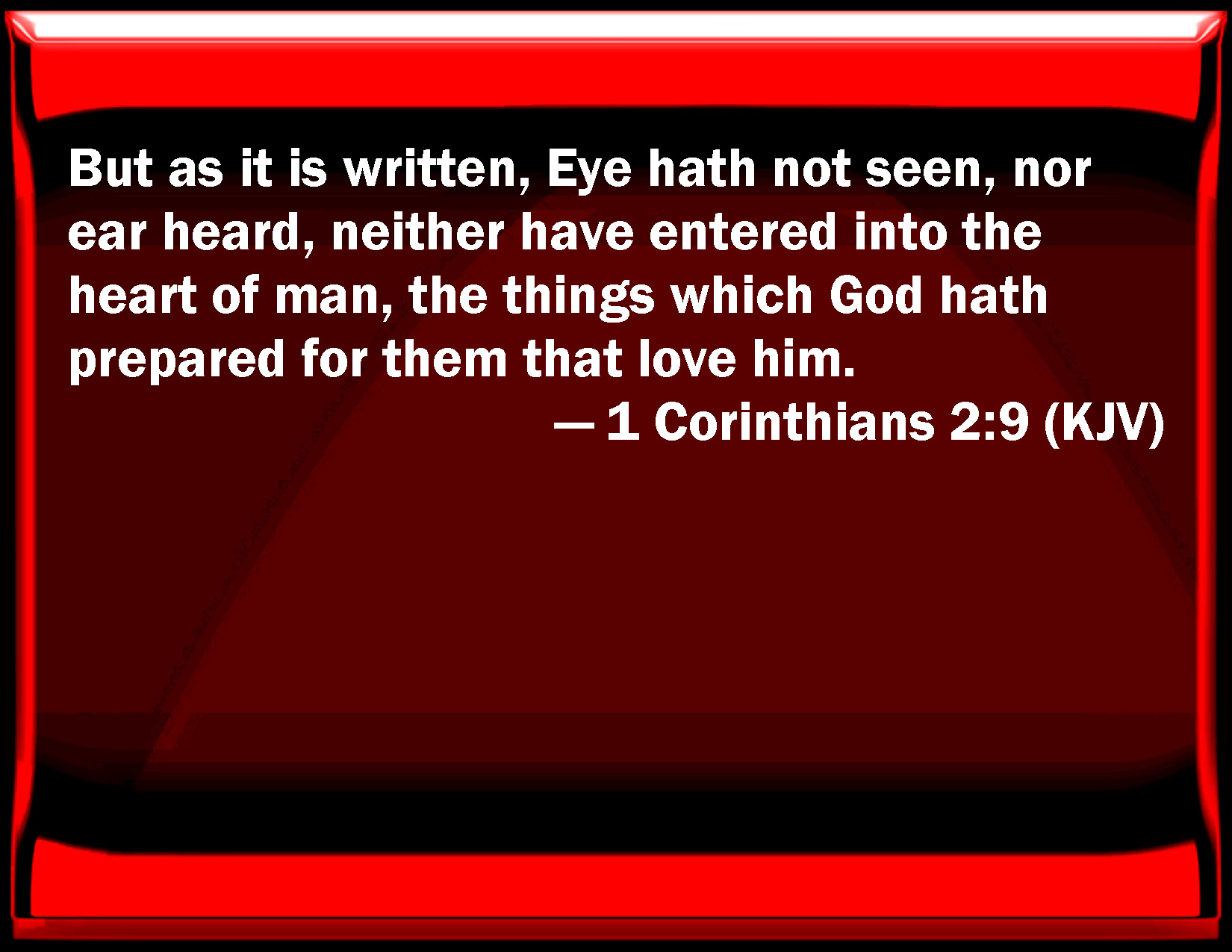 Bible Verse Slide 1 Corinthians 2:9 But as it is written, Eye has not seen, nor ear heard, neither have entered into the heart of man, the things which God has prepared for them that love him. KJV: But as it is written, Eye hath not seen, nor ear heard, neither have entered into the heart of man, the things which God hath prepared for them that love him. DRB: But, as it is written: That eye hath not seen, nor ear heard, neither hath it entered into the heart of man, what things God hath prepared for them that love him. DBT: but according as it is written, Things which eye has not seen, and ear not heard, and which have not come into man's heart, which God has prepared for them that love him, ERV: but as it is written, Things which eye saw not, and ear heard not, And which entered not into the heart of man, Whatsoever things God prepared for them that love him. WBT: But as it is written, Eye hath not seen, nor ear heard, neither have entered into the heart of man, the things which God hath prepared for them that love him. WEB: But as it is written, "Things which an eye didn't see, and an ear didn't hear, which didn't enter into the heart of man, these God has prepared for those who love him." YLT: but, according as it hath been written, 'What eye did not see, and ear did not hear, and upon the heart of man came not up, what God did prepare for those loving Him — 'Links 1 Corinthians 2:9 NIV • 1 Corinthians 2:9 NLT • 1 Corinthians 2:9 ESV • 1 Corinthians 2:9 NASB • 1 Corinthians 2:9 KJV • 1 Corinthians 2:9 Interlinear • 1 Corinthians 2:9 Commentaries • 1 Corinthians 2:9 Parallel Texts • 1 Corinthians 2:9 Bible Apps • 1 Corinthians 2:9 Parallel • Bible Hub |