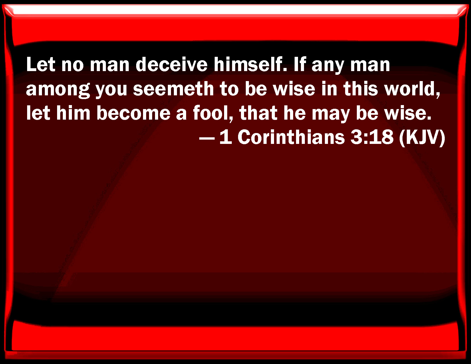 Bible Verse Slide 1 Corinthians 3:18 Let no man deceive himself. If any man among you seems to be wise in this world, let him become a fool, that he may be wise. KJV: Let no man deceive himself. If any man among you seemeth to be wise in this world, let him become a fool, that he may be wise. DRB: Let no man deceive himself: if any man among you seem to be wise in this world, let him become a fool, that he may be wise. DBT: Let no one deceive himself: if any one thinks himself to be wise among you in this world, let him become foolish, that he may be wise. ERV: Let no man deceive himself. If any man thinketh that he is wise among you in this world, let him become a fool, that he may become wise. WBT: Let no man deceive himself. If any man among you seemeth to be wise in this world, let him become a fool, that he may be wise. WEB: Let no one deceive himself. If anyone thinks that he is wise among you in this world, let him become a fool, that he may become wise. YLT: Let no one deceive himself; if any one doth seem to be wise among you in this age — let him become a fool, that he may become wise,Links 1 Corinthians 3:18 NIV • 1 Corinthians 3:18 NLT • 1 Corinthians 3:18 ESV • 1 Corinthians 3:18 NASB • 1 Corinthians 3:18 KJV • 1 Corinthians 3:18 Interlinear • 1 Corinthians 3:18 Commentaries • 1 Corinthians 3:18 Parallel Texts • 1 Corinthians 3:18 Bible Apps • 1 Corinthians 3:18 Parallel • Bible Hub |