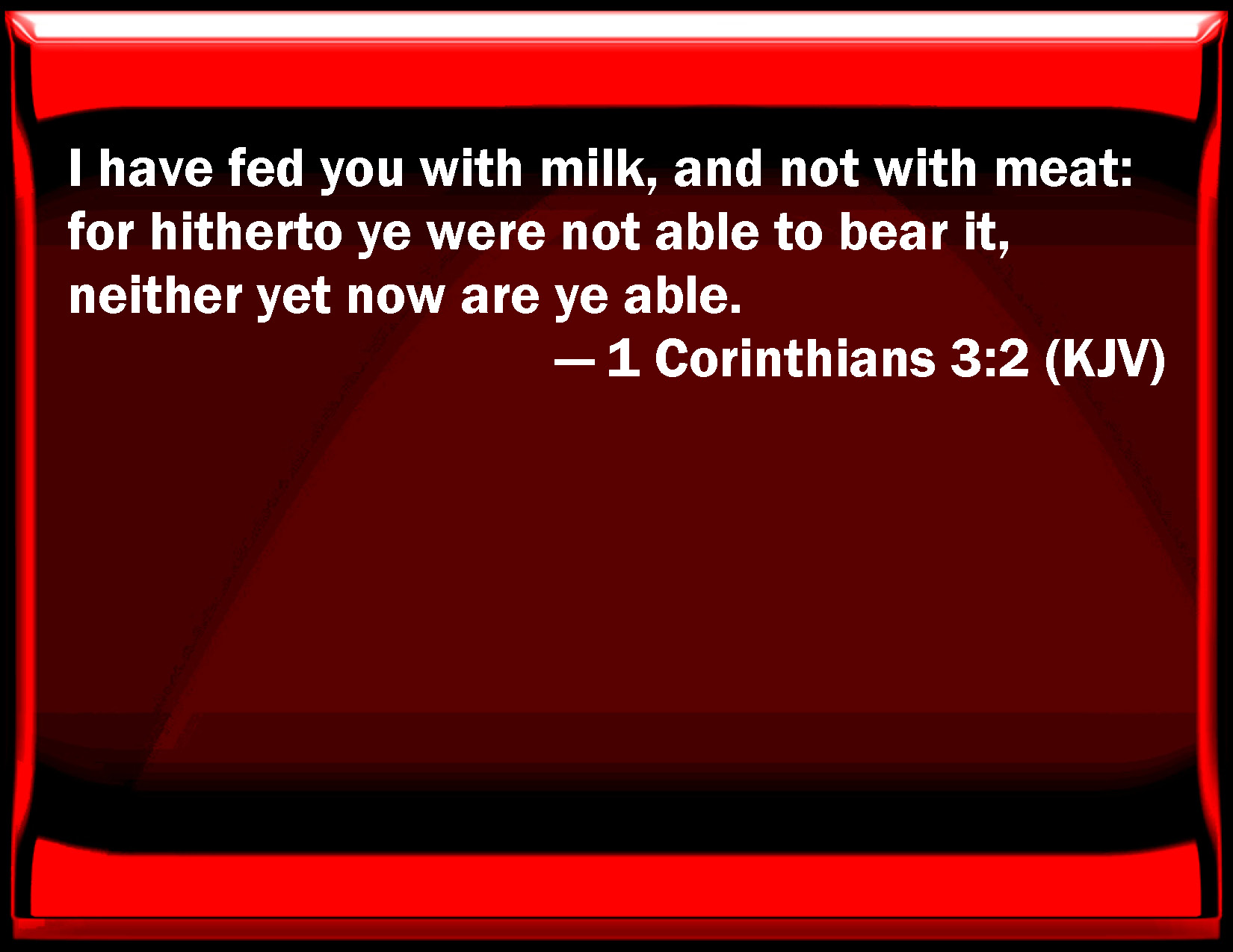 Bible Verse Slide 1 Corinthians 3:2 I have fed you with milk, and not with meat: for till now you were not able to bear it, neither yet now are you able. KJV: I have fed you with milk, and not with meat: for hitherto ye were not able to bear it, neither yet now are ye able. DRB: I gave you milk to drink, not meat; for you were not able as yet. But neither indeed are you now able; for you are yet carnal. DBT: I have given you milk to drink, not meat, for ye have not yet been able, nor indeed are ye yet able; ERV: I fed you with milk, not with meat; for ye were not yet able to bear it: nay, not even now are ye able; WBT: I have fed you with milk, and not with meat: for hitherto ye were not able to bear it, neither yet now are ye able. WEB: I fed you with milk, not with meat; for you weren't yet ready. Indeed, not even now are you ready, YLT: with milk I fed you, and not with meat, for ye were not yet able, but not even yet are ye now able,Links 1 Corinthians 3:2 NIV • 1 Corinthians 3:2 NLT • 1 Corinthians 3:2 ESV • 1 Corinthians 3:2 NASB • 1 Corinthians 3:2 KJV • 1 Corinthians 3:2 Interlinear • 1 Corinthians 3:2 Commentaries • 1 Corinthians 3:2 Parallel Texts • 1 Corinthians 3:2 Bible Apps • 1 Corinthians 3:2 Parallel • Bible Hub |