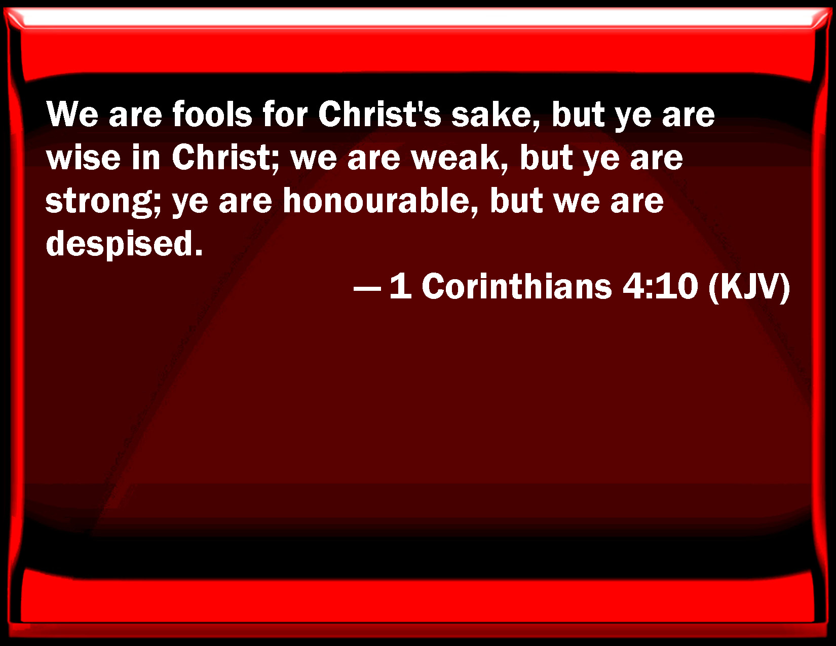 Bible Verse Slide 1 Corinthians 4:10 We are fools for Christ's sake, but you are wise in Christ; we are weak, but you are strong; you are honorable, but we are despised. KJV: We are fools for Christ's sake, but ye are wise in Christ; we are weak, but ye are strong; ye are honourable, but we are despised. DRB: We are fools for Christ's sake, but you are wise in Christ; we are weak, but you are strong; you are honourable, but we without honour. DBT: We are fools for Christ's sake, but ye prudent in Christ: we weak, but ye strong: ye glorious, but we in dishonour. ERV: We are fools for Christ's sake, but ye are wise in Christ; we are weak, but ye are strong; ye have glory, but we have dishonour. WBT: We are fools for Christ's sake, but ye are wise in Christ; we are weak, but ye are strong; ye are honorable, but we are despised. WEB: We are fools for Christ's sake, but you are wise in Christ. We are weak, but you are strong. You have honor, but we have dishonor. YLT: we are fools because of Christ, and ye wise in Christ; we are ailing, and ye strong; ye glorious, and we dishonoured;Links 1 Corinthians 4:10 NIV • 1 Corinthians 4:10 NLT • 1 Corinthians 4:10 ESV • 1 Corinthians 4:10 NASB • 1 Corinthians 4:10 KJV • 1 Corinthians 4:10 Interlinear • 1 Corinthians 4:10 Commentaries • 1 Corinthians 4:10 Parallel Texts • 1 Corinthians 4:10 Bible Apps • 1 Corinthians 4:10 Parallel • Bible Hub |