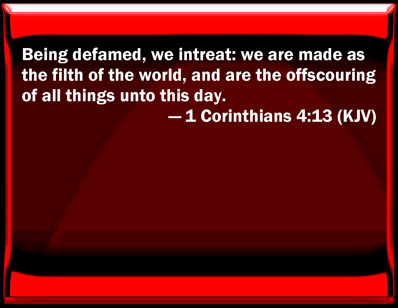 Bible Verse Slide 1 Corinthians 4:13 Being defamed, we entreat: we are made as the filth of the world, and are the offscouring of all things to this day. KJV: Being defamed, we intreat: we are made as the filth of the world, and are the offscouring of all things unto this day. DRB: We are blasphemed, and we entreat; we are made as the refuse of this world, the offscouring of all even until now. DBT: insulted, we entreat: we are become as the offscouring of the world, the refuse of all, until now. ERV: being defamed, we entreat: we are made as the filth of the world, the offscouring of all things, even until now. WBT: Being defamed, we entreat: we are made as the filth of the world, the offscouring of all things to this day. WEB: Being defamed, we entreat. We are made as the filth of the world, the dirt wiped off by all, even until now. YLT: being spoken evil of, we entreat; as filth of the world we did become — of all things an offscouring — till now.Links 1 Corinthians 4:13 NIV • 1 Corinthians 4:13 NLT • 1 Corinthians 4:13 ESV • 1 Corinthians 4:13 NASB • 1 Corinthians 4:13 KJV • 1 Corinthians 4:13 Interlinear • 1 Corinthians 4:13 Commentaries • 1 Corinthians 4:13 Parallel Texts • 1 Corinthians 4:13 Bible Apps • 1 Corinthians 4:13 Parallel • Bible Hub |