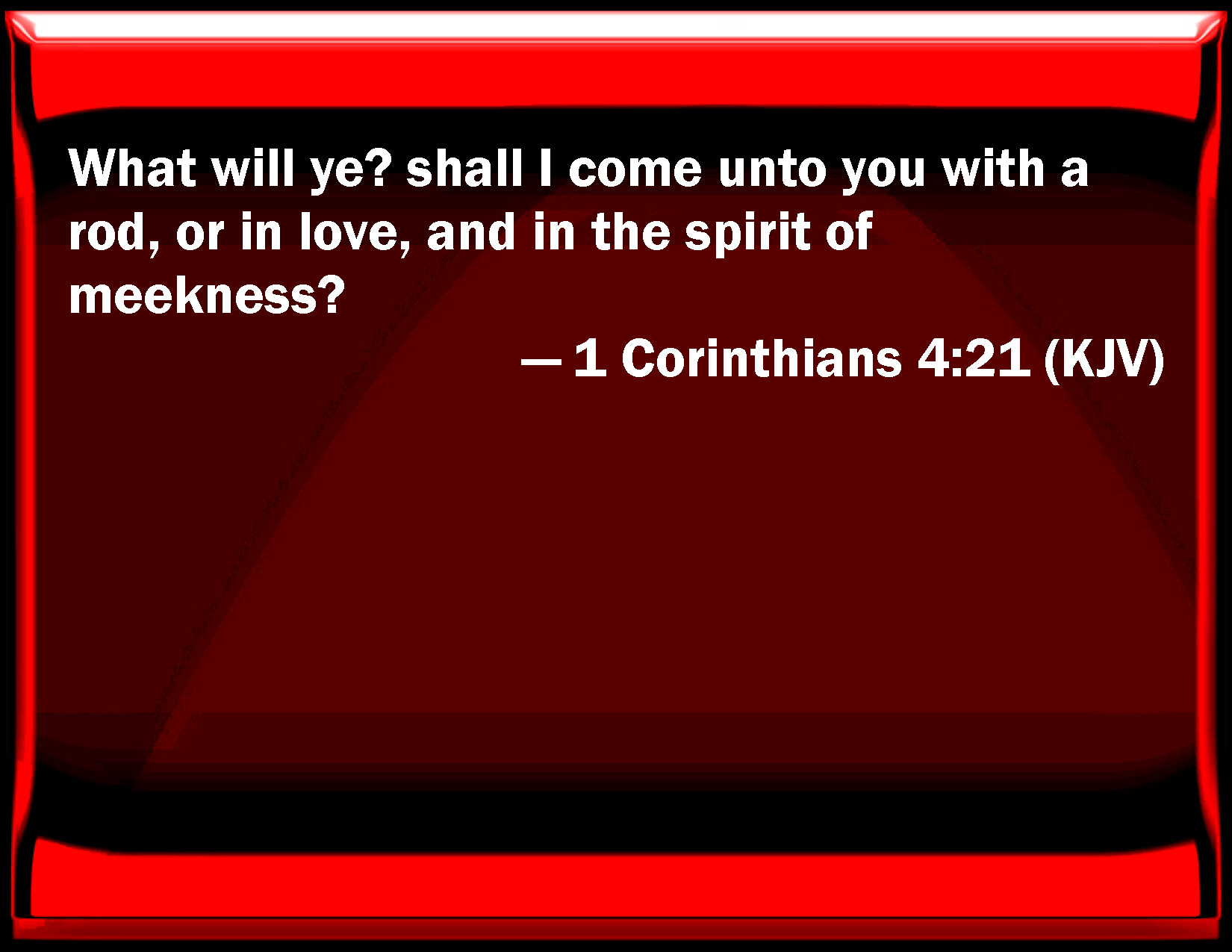 Bible Verse Slide 1 Corinthians 4:21 What will you? shall I come to you with a rod, or in love, and in the spirit of meekness? KJV: What will ye? shall I come unto you with a rod, or in love, and in the spirit of meekness? DRB: What will you ? shall I come to you with a rod; or in charity, and in the spirit of meekness ? DBT: What will ye? that I come to you with a rod; or in love, and in a spirit of meekness? ERV: What will ye? shall I come unto you with a rod, or in love and a spirit of meekness? WBT: What will ye? shall I come to you with a rod, or in love, and in the spirit of meekness? WEB: What do you want? Shall I come to you with a rod, or in love and a spirit of gentleness? YLT: what do ye wish? with a rod shall I come unto you, or in love, with a spirit also of meekness?Links 1 Corinthians 4:21 NIV • 1 Corinthians 4:21 NLT • 1 Corinthians 4:21 ESV • 1 Corinthians 4:21 NASB • 1 Corinthians 4:21 KJV • 1 Corinthians 4:21 Interlinear • 1 Corinthians 4:21 Commentaries • 1 Corinthians 4:21 Parallel Texts • 1 Corinthians 4:21 Bible Apps • 1 Corinthians 4:21 Parallel • Bible Hub |