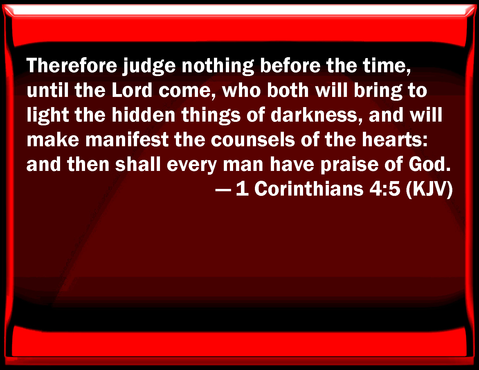 Bible Verse Slide 1 Corinthians 4:5 Therefore judge nothing before the time, until the Lord come, who both will bring to light the hidden things of darkness, and will make manifest the counsels of the hearts: and then shall every man have praise of God. KJV: Therefore judge nothing before the time, until the Lord come, who both will bring to light the hidden things of darkness, and will make manifest the counsels of the hearts: and then shall every man have praise of God. DRB: Therefore judge not before the time; until the Lord come, who both will bring to light the hidden things of darkness, and will make manifest the counsels of the hearts; and then shall every man have praise from God. DBT: So that do not judge anything before the time, until the Lord shall come, who shall also both bring to light the hidden things of darkness, and shall make manifest the counsels of hearts; and then shall each have his praise from God. ERV: Wherefore judge nothing before the time, until the Lord come, who will both bring to light the hidden things of darkness, and make manifest the counsels of the hearts; and then shall each man have his praise from God. WBT: Therefore judge nothing before the time, until the Lord shall come, who will both bring to light the hidden things of darkness, and will make manifest the counsels of the hearts: and then shall every man have praise from God. WEB: Therefore judge nothing before the time, until the Lord comes, who will both bring to light the hidden things of darkness, and reveal the counsels of the hearts. Then each man will get his praise from God. YLT: so, then, nothing before the time judge ye, till the Lord may come, who will both bring to light the hidden things of the darkness, and will manifest the counsels of the hearts, and then the praise shall come to each from God.Links 1 Corinthians 4:5 NIV • 1 Corinthians 4:5 NLT • 1 Corinthians 4:5 ESV • 1 Corinthians 4:5 NASB • 1 Corinthians 4:5 KJV • 1 Corinthians 4:5 Interlinear • 1 Corinthians 4:5 Commentaries • 1 Corinthians 4:5 Parallel Texts • 1 Corinthians 4:5 Bible Apps • 1 Corinthians 4:5 Parallel • Bible Hub |