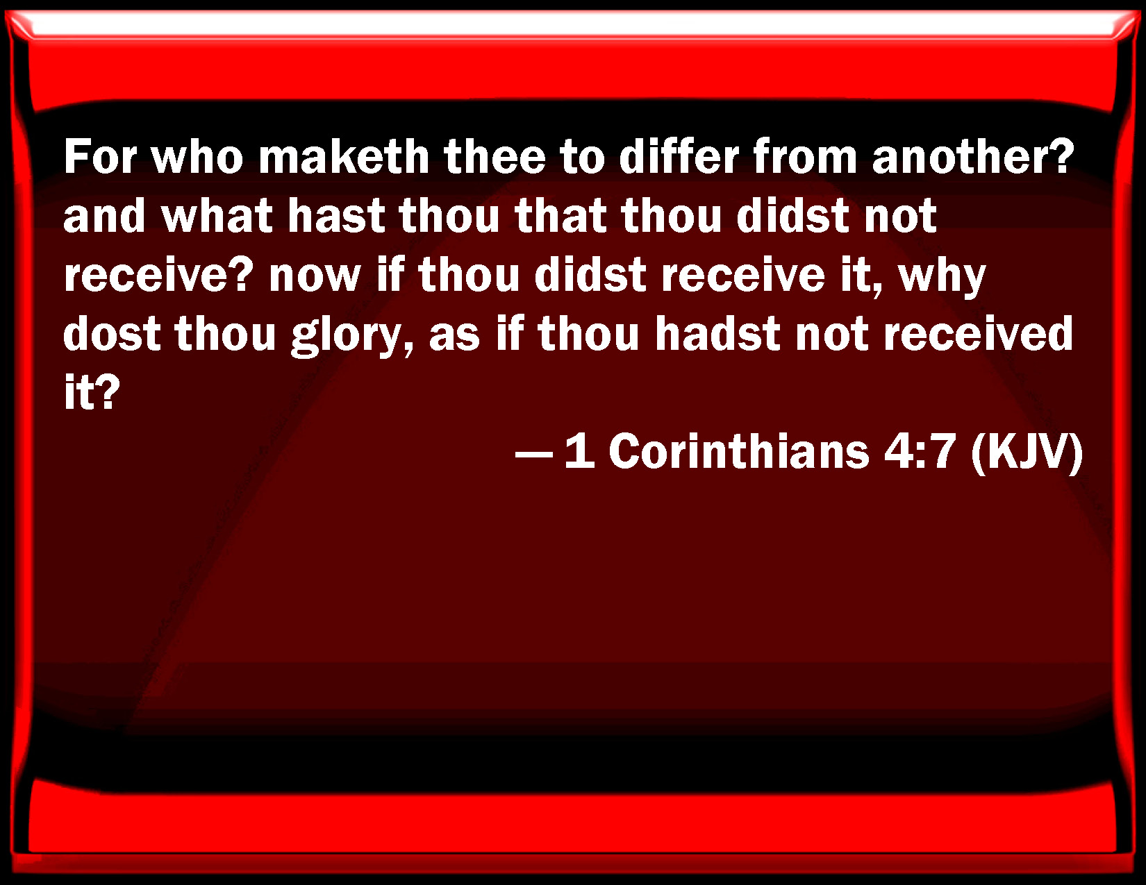 Bible Verse Slide 1 Corinthians 4:7 For who makes you to differ from another? and what have you that you did not receive? now if you did receive it, why do you glory, as if you had not received it? KJV: For who maketh thee to differ from another? and what hast thou that thou didst not receive? now if thou didst receive it, why dost thou glory, as if thou hadst not received it? DRB: For who distinguisheth thee ? Or what hast thou that thou hast not received ? And if thou hast received, why dost thou glory, as if thou hadst not received it ? DBT: For who makes thee to differ? and what hast thou which thou hast not received? but if also thou hast received, why boastest thou as not receiving? ERV: For who maketh thee to differ? and what hast thou that thou didst not receive? but if thou didst receive it, why dost thou glory, as if thou hadst not received it? WBT: For who maketh thee to differ from another? and what hast thou that thou didst not receive? now if thou didst receive it, why dost thou glory, as if thou hadst not received it? WEB: For who makes you different? And what do you have that you didn't receive? But if you did receive it, why do you boast as if you had not received it? YLT: for who doth make thee to differ? and what hast thou, that thou didst not receive? and if thou didst also receive, why dost thou glory as not having received?Links 1 Corinthians 4:7 NIV • 1 Corinthians 4:7 NLT • 1 Corinthians 4:7 ESV • 1 Corinthians 4:7 NASB • 1 Corinthians 4:7 KJV • 1 Corinthians 4:7 Interlinear • 1 Corinthians 4:7 Commentaries • 1 Corinthians 4:7 Parallel Texts • 1 Corinthians 4:7 Bible Apps • 1 Corinthians 4:7 Parallel • Bible Hub |