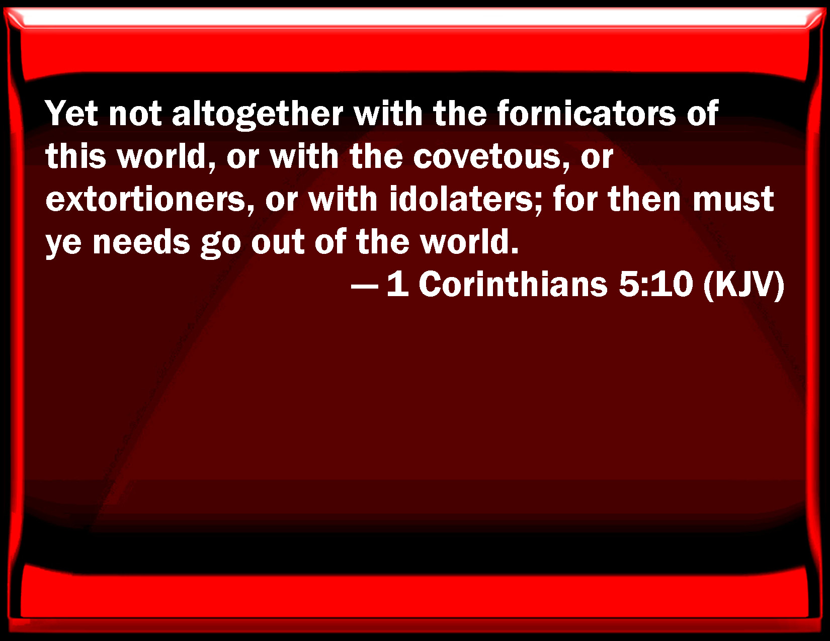 Bible Verse Slide 1 Corinthians 5:10 Yet not altogether with the fornicators of this world, or with the covetous, or extortionists, or with idolaters; for then must you needs go out of the world. KJV: Yet not altogether with the fornicators of this world, or with the covetous, or extortioners, or with idolaters; for then must ye needs go out of the world. DRB: I mean not with the fornicators of this world, or with the covetous, or the extortioners, or the servers of idols; otherwise you must needs go out of this world. DBT: not altogether with the fornicators of this world, or with the avaricious and rapacious, or idolaters, since then ye should go out of the world. ERV: not altogether with the fornicators of this world, or with the covetous and extortioners, or with idolaters; for then must ye needs go out of the world: WBT: Yet not altogether with lewd persons of this world, or with the covetous, or extortioners, or with idolaters: for then ye must needs go out of the world. WEB: yet not at all meaning with the sexual sinners of this world, or with the covetous and extortioners, or with idolaters; for then you would have to leave the world. YLT: and not certainly with the whoremongers of this world, or with the covetous, or extortioners, or idolaters, seeing ye ought then to go forth out of the world — Links 1 Corinthians 5:10 NIV • 1 Corinthians 5:10 NLT • 1 Corinthians 5:10 ESV • 1 Corinthians 5:10 NASB • 1 Corinthians 5:10 KJV • 1 Corinthians 5:10 Interlinear • 1 Corinthians 5:10 Commentaries • 1 Corinthians 5:10 Parallel Texts • 1 Corinthians 5:10 Bible Apps • 1 Corinthians 5:10 Parallel • Bible Hub |