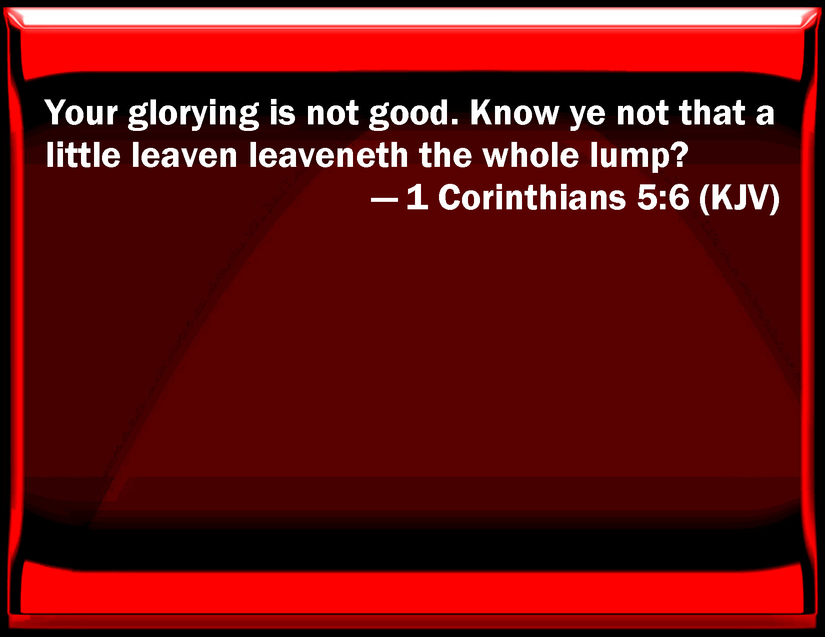 1 Corinthians 5:6 Your glorying is not good. Know you not that a little leaven leavens the whole lump?
