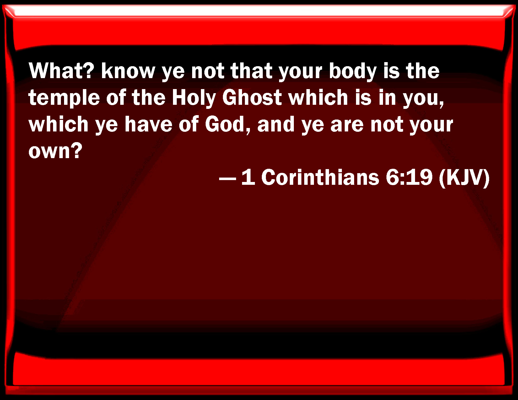 Bible Verse Slide 1 Corinthians 6:19 What? know you not that your body is the temple of the Holy Ghost which is in you, which you have of God, and you are not your own? KJV: What? know ye not that your body is the temple of the Holy Ghost which is in you, which ye have of God, and ye are not your own? DRB: Or know you not, that your members are the temple of the Holy Ghost, who is in you, whom you have from God; and you are not your own ? DBT: Do ye not know that your body is the temple of the Holy Spirit which is in you, which ye have of God; and ye are not your own? ERV: Or know ye not that your body is a temple of the Holy Ghost which is in you, which ye have from God? and ye are not your own; WBT: What, know ye not that your body is the temple of the Holy Spirit which is in you, which ye have from God, and ye are not your own? WEB: Or don't you know that your body is a temple of the Holy Spirit which is in you, which you have from God? You are not your own, YLT: Have ye not known that your body is a sanctuary of the Holy Spirit in you, which ye have from God? and ye are not your own,Links 1 Corinthians 6:19 NIV • 1 Corinthians 6:19 NLT • 1 Corinthians 6:19 ESV • 1 Corinthians 6:19 NASB • 1 Corinthians 6:19 KJV • 1 Corinthians 6:19 Interlinear • 1 Corinthians 6:19 Commentaries • 1 Corinthians 6:19 Parallel Texts • 1 Corinthians 6:19 Bible Apps • 1 Corinthians 6:19 Parallel • Bible Hub |