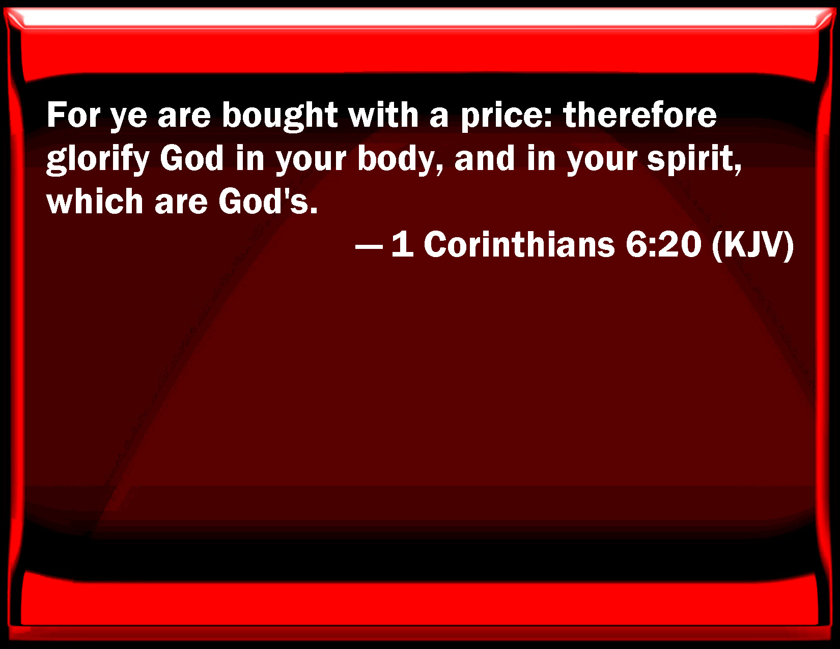 Bible Verse Slide 1 Corinthians 6:20 For you are bought with a price: therefore glorify God in your body, and in your spirit, which are God's. KJV: For ye are bought with a price: therefore glorify God in your body, and in your spirit, which are God's. DRB: For you are bought with a great price. Glorify and bear God in your body. DBT: for ye have been bought with a price: glorify now then God in your body. ERV: for ye were bought with a price: glorify God therefore in your body. WBT: For ye are bought with a price: therefore glorify God in your body, and in your spirit, which are God's. WEB: for you were bought with a price. Therefore glorify God in your body and in your spirit, which are God's. YLT: for ye were bought with a price; glorify, then, God in your body and in your spirit, which are God's.Links 1 Corinthians 6:20 NIV • 1 Corinthians 6:20 NLT • 1 Corinthians 6:20 ESV • 1 Corinthians 6:20 NASB • 1 Corinthians 6:20 KJV • 1 Corinthians 6:20 Interlinear • 1 Corinthians 6:20 Commentaries • 1 Corinthians 6:20 Parallel Texts • 1 Corinthians 6:20 Bible Apps • 1 Corinthians 6:20 Parallel • Bible Hub |