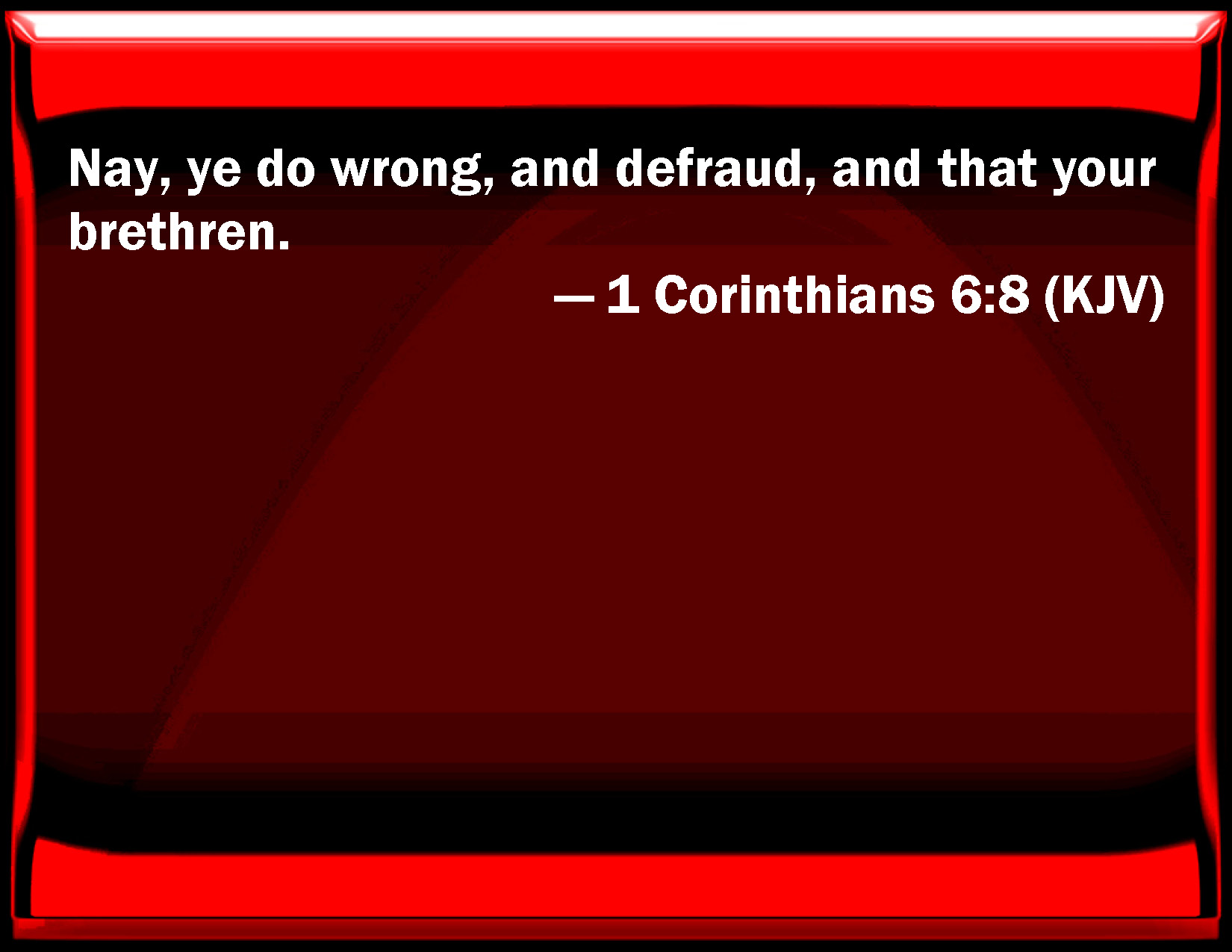 Bible Verse Slide 1 Corinthians 6:8 No, you do wrong, and defraud, and that your brothers. KJV: Nay, ye do wrong, and defraud, and that your brethren. DRB: But you do wrong and defraud, and that to your brethren. DBT: But ye do wrong, and defraud, and this your brethren. ERV: Nay, but ye yourselves do wrong, and defraud, and that your brethren. WBT: But ye do wrong, and defraud, and that your brethren. WEB: No, but you yourselves do wrong, and defraud, and that against your brothers. YLT: but ye — ye do injustice, and ye defraud, and these — brethren!Links 1 Corinthians 6:8 NIV • 1 Corinthians 6:8 NLT • 1 Corinthians 6:8 ESV • 1 Corinthians 6:8 NASB • 1 Corinthians 6:8 KJV • 1 Corinthians 6:8 Interlinear • 1 Corinthians 6:8 Commentaries • 1 Corinthians 6:8 Parallel Texts • 1 Corinthians 6:8 Bible Apps • 1 Corinthians 6:8 Parallel • Bible Hub |