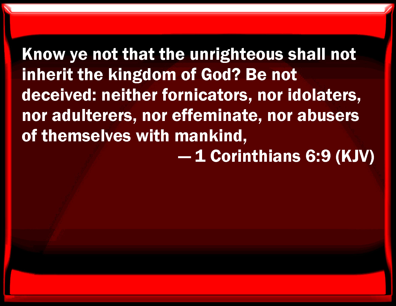 Bible Verse Slide 1 Corinthians 6:9 Know you not that the unrighteous shall not inherit the kingdom of God? Be not deceived: neither fornicators, nor idolaters, nor adulterers, nor effeminate, nor abusers of themselves with mankind, KJV: Know ye not that the unrighteous shall not inherit the kingdom of God? Be not deceived: neither fornicators, nor idolaters, nor adulterers, nor effeminate, nor abusers of themselves with mankind, DRB: Know you not that the unjust shall not possess the kingdom of God? Do not err: neither fornicators, nor idolaters, nor adulterers, DBT: Do ye not know that unrighteous persons shall not inherit the kingdom of God? Do not err: neither fornicators, nor idolaters, nor adulterers, nor those who make women of themselves, nor who abuse themselves with men, ERV: Or know ye not that the unrighteous shall not inherit the kingdom of God? Be not deceived: neither fornicators, nor idolaters, nor adulterers, nor effeminate, nor abusers of themselves with men, WBT: Know ye not that the unrighteous shall not inherit the kingdom of God? Be not deceived; neither fornicators, nor idolaters, nor adulterers, nor effeminate, nor abusers of themselves with mankind, WEB: Or don't you know that the unrighteous will not inherit the Kingdom of God? Don't be deceived. Neither the sexually immoral, nor idolaters, nor adulterers, nor male prostitutes, nor homosexuals, YLT: have ye not known that the unrighteous the reign of God shall not inherit? be not led astray; neither whoremongers, nor idolaters, nor adulterers, nor effeminate, nor sodomites,Links 1 Corinthians 6:9 NIV • 1 Corinthians 6:9 NLT • 1 Corinthians 6:9 ESV • 1 Corinthians 6:9 NASB • 1 Corinthians 6:9 KJV • 1 Corinthians 6:9 Interlinear • 1 Corinthians 6:9 Commentaries • 1 Corinthians 6:9 Parallel Texts • 1 Corinthians 6:9 Bible Apps • 1 Corinthians 6:9 Parallel • Bible Hub |