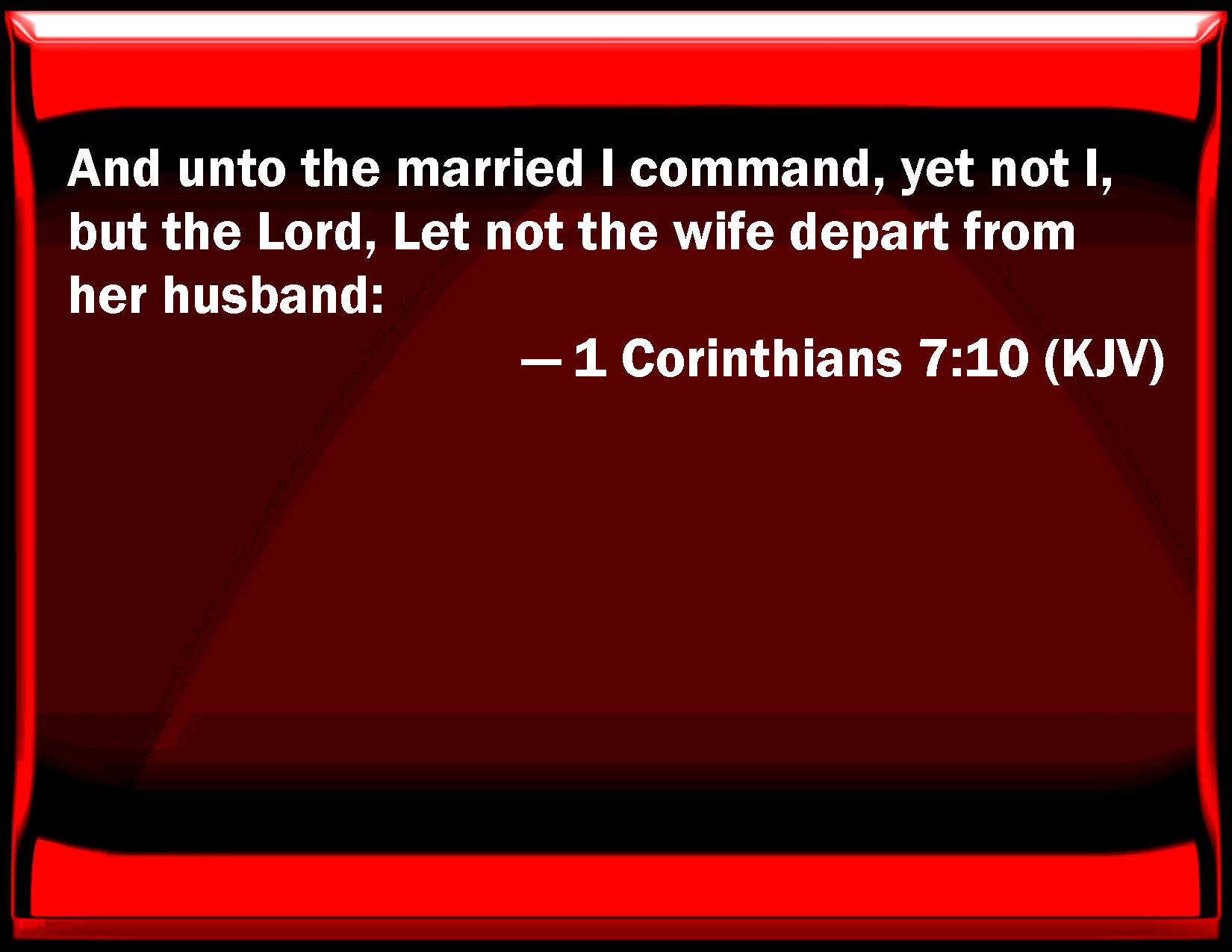 Bible Verse Slide 1 Corinthians 7:10 And to the married I command, yet not I, but the Lord, Let not the wife depart from her husband: KJV: And unto the married I command, yet not I, but the Lord, Let not the wife depart from her husband: DRB: But to them that are married, not I but the Lord commandeth, that the wife depart not from her husband. DBT: But to the married I enjoin, not I, but the Lord, Let not wife be separated from husband; ERV: But unto the married I give charge, yea not I, but the Lord, That the wife depart not from her husband WBT: And to the married I command, yet not I, but the Lord, Let not the wife depart from her husband: WEB: But to the married I command—not I, but the Lord—that the wife not leave her husband YLT: and to the married I announce — not I, but the Lord — let not a wife separate from a husband:Links 1 Corinthians 7:10 NIV • 1 Corinthians 7:10 NLT • 1 Corinthians 7:10 ESV • 1 Corinthians 7:10 NASB • 1 Corinthians 7:10 KJV • 1 Corinthians 7:10 Interlinear • 1 Corinthians 7:10 Commentaries • 1 Corinthians 7:10 Parallel Texts • 1 Corinthians 7:10 Bible Apps • 1 Corinthians 7:10 Parallel • Bible Hub |