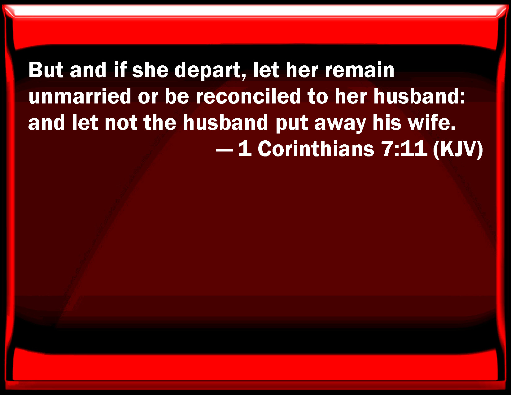 Bible Verse Slide 1 Corinthians 7:11 But and if she depart, let her remain unmarried or be reconciled to her husband: and let not the husband put away his wife. KJV: But and if she depart, let her remain unmarried, or be reconciled to her husband: and let not the husband put away his wife. DRB: And if she depart, that she remain unmarried, or be reconciled to her husband. And let not the husband put away his wife. DBT: (but if also she shall have been separated, let her remain unmarried, or be reconciled to her husband;) and let not husband leave wife. ERV: (but and if she depart, let her remain unmarried, or else be reconciled to her husband); and that the husband leave not his wife. WBT: But if she shall depart, let her remain unmarried, or be reconciled to her husband: and let not the husband put away his wife. WEB: (but if she departs, let her remain unmarried, or else be reconciled to her husband), and that the husband not leave his wife. YLT: but and if she may separate, let her remain unmarried, or to the husband let her be reconciled, and let not a husband send away a wife.Links 1 Corinthians 7:11 NIV • 1 Corinthians 7:11 NLT • 1 Corinthians 7:11 ESV • 1 Corinthians 7:11 NASB • 1 Corinthians 7:11 KJV • 1 Corinthians 7:11 Interlinear • 1 Corinthians 7:11 Commentaries • 1 Corinthians 7:11 Parallel Texts • 1 Corinthians 7:11 Bible Apps • 1 Corinthians 7:11 Parallel • Bible Hub |