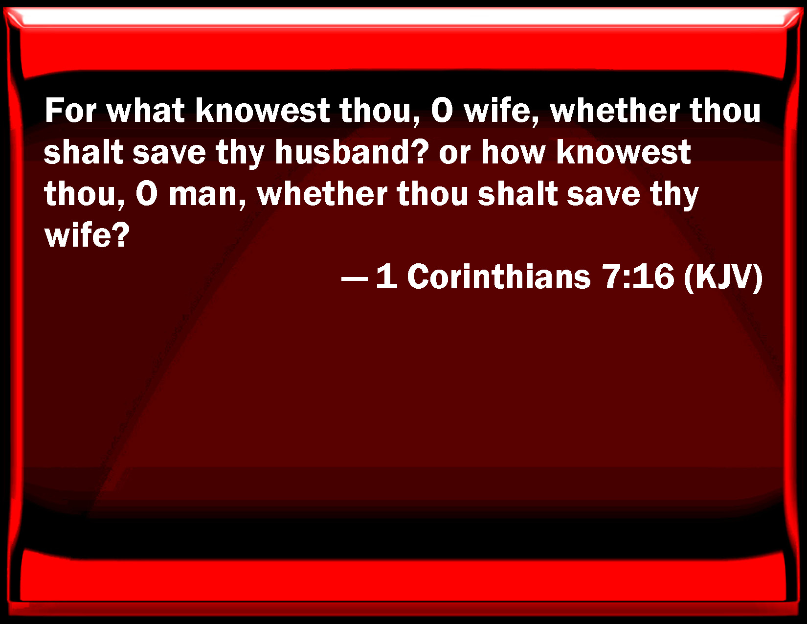 Bible Verse Slide 1 Corinthians 7:16 For what know you, O wife, whether you shall save your husband? or how know you, O man, whether you shall save your wife? KJV: For what knowest thou, O wife, whether thou shalt save thy husband? or how knowest thou, O man, whether thou shalt save thy wife? DRB: For how knowest thou, O wife, whether thou shalt save thy husband ? Or how knowest thou, O man, whether thou shalt save thy wife ? DBT: For what knowest thou, O wife, if thou shalt save thy husband? or what knowest thou, O husband, if thou shalt save thy wife? ERV: For how knowest thou, O wife, whether thou shalt save thy husband? or how knowest thou, O husband, whether thou shalt save thy wife? WBT: For how knowest thou, O wife, whether thou shalt save thy husband? or how knowest thou, O man, whether thou shalt save thy wife? WEB: For how do you know, wife, whether you will save your husband? Or how do you know, husband, whether you will save your wife? YLT: for what, hast thou known, O wife, whether the husband thou shalt save? or what, hast thou known, O husband, whether the wife thou shalt save?Links 1 Corinthians 7:16 NIV • 1 Corinthians 7:16 NLT • 1 Corinthians 7:16 ESV • 1 Corinthians 7:16 NASB • 1 Corinthians 7:16 KJV • 1 Corinthians 7:16 Interlinear • 1 Corinthians 7:16 Commentaries • 1 Corinthians 7:16 Parallel Texts • 1 Corinthians 7:16 Bible Apps • 1 Corinthians 7:16 Parallel • Bible Hub |