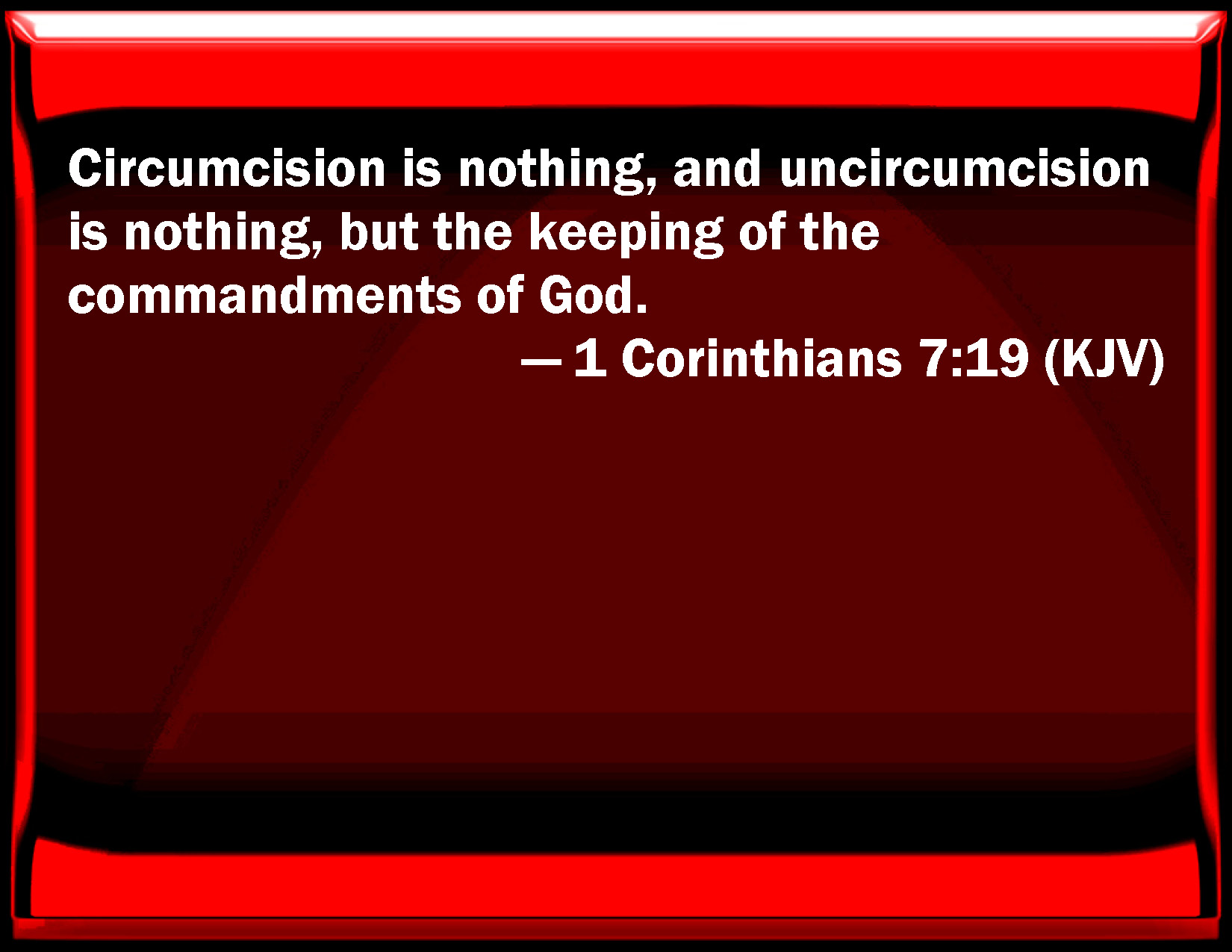 Bible Verse Slide 1 Corinthians 7:19 Circumcision is nothing, and uncircumcision is nothing, but the keeping of the commandments of God. KJV: Circumcision is nothing, and uncircumcision is nothing, but the keeping of the commandments of God. DRB: Circumcision is nothing, and uncircumcision is nothing: but the observance of the commandments of God. DBT: Circumcision is nothing, and uncircumcision is nothing; but keeping God's commandments. ERV: Circumcision is nothing, and uncircumcision is nothing; but the keeping of the commandments of God. WBT: Circumcision is nothing, and uncircumcision is nothing, but the keeping of the commandments of God. WEB: Circumcision is nothing, and uncircumcision is nothing, but the keeping of the commandments of God. YLT: the circumcision is nothing, and the uncircumcision is nothing — but a keeping of the commands of God.Links 1 Corinthians 7:19 NIV • 1 Corinthians 7:19 NLT • 1 Corinthians 7:19 ESV • 1 Corinthians 7:19 NASB • 1 Corinthians 7:19 KJV • 1 Corinthians 7:19 Interlinear • 1 Corinthians 7:19 Commentaries • 1 Corinthians 7:19 Parallel Texts • 1 Corinthians 7:19 Bible Apps • 1 Corinthians 7:19 Parallel • Bible Hub |