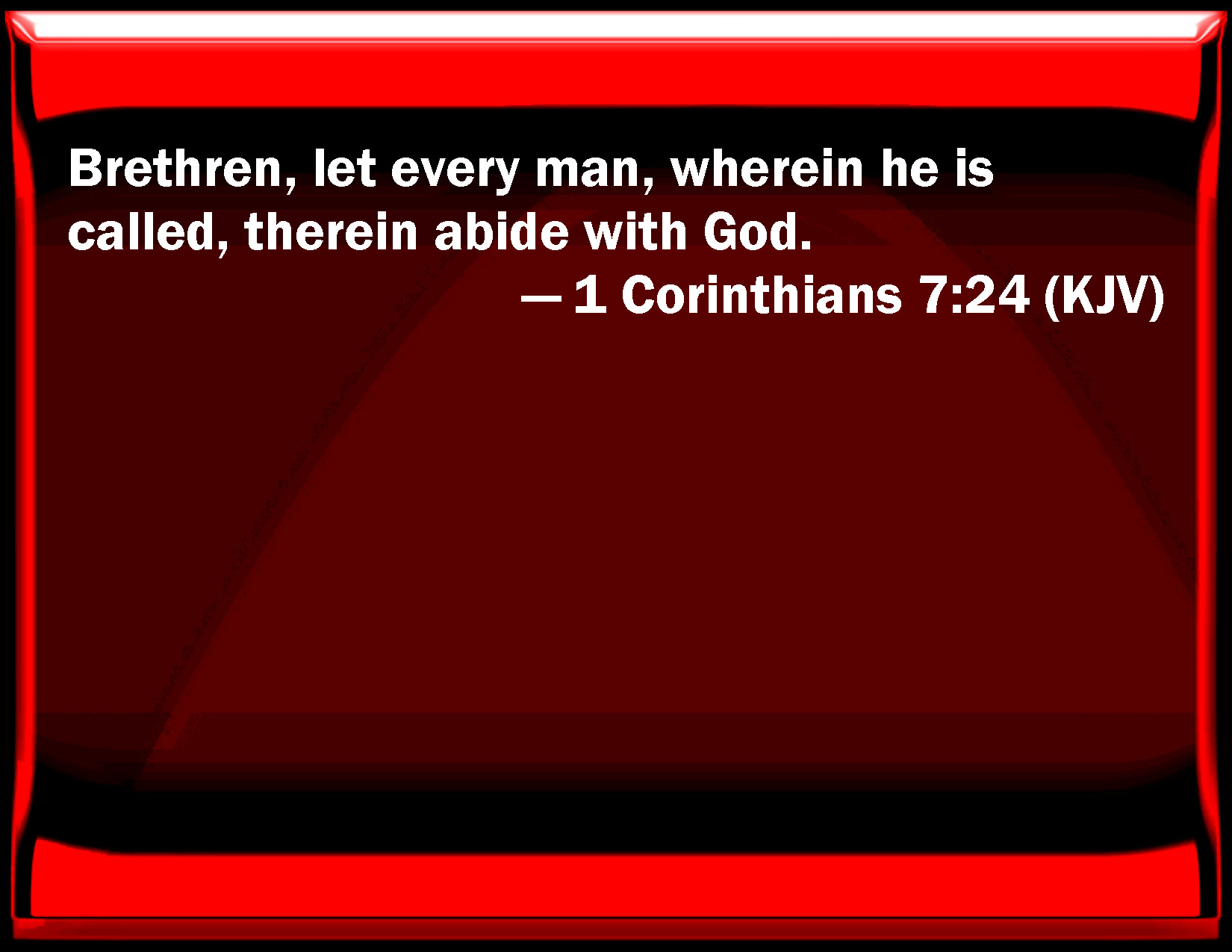 Bible Verse Slide 1 Corinthians 7:24 Brothers, let every man, wherein he is called, therein abide with God. KJV: Brethren, let every man, wherein he is called, therein abide with God. DRB: Brethren, let every man, wherein he was called, therein abide with God. DBT: Let each, wherein he is called, brethren, therein abide with God. ERV: Brethren, let each man, wherein he was called, therein abide with God. WBT: Brethren, let every man in the state in which he is called, continue in it with God. WEB: Brothers, let each man, in whatever condition he was called, stay in that condition with God. YLT: each, in that in which he was called, brethren, in this let him remain with God.Links 1 Corinthians 7:24 NIV • 1 Corinthians 7:24 NLT • 1 Corinthians 7:24 ESV • 1 Corinthians 7:24 NASB • 1 Corinthians 7:24 KJV • 1 Corinthians 7:24 Interlinear • 1 Corinthians 7:24 Commentaries • 1 Corinthians 7:24 Parallel Texts • 1 Corinthians 7:24 Bible Apps • 1 Corinthians 7:24 Parallel • Bible Hub |