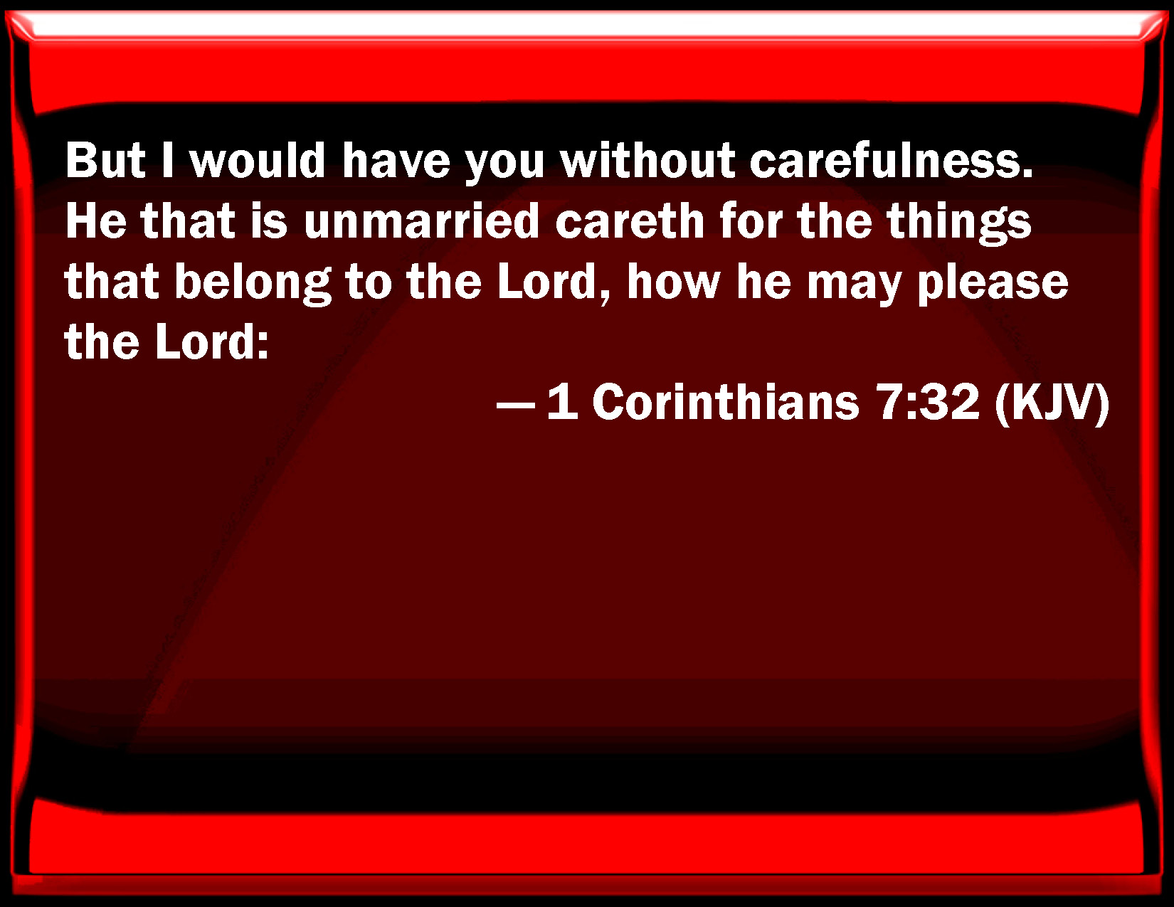 Bible Verse Slide 1 Corinthians 7:32 But I would have you without carefulness. He that is unmarried cares for the things that belong to the Lord, how he may please the Lord: KJV: But I would have you without carefulness. He that is unmarried careth for the things that belong to the Lord, how he may please the Lord: DRB: But I would have you to be without solicitude. He that is without a wife, is solicitous for the things that belong to the Lord, how he may please God. DBT: But I wish you to be without care. The unmarried cares for the things of the Lord, how he shall please the Lord; ERV: But I would have you to be free from cares. He that is unmarried is careful for the things of the Lord, how he may please the Lord: WBT: But I would have you without anxious care. He that is unmarried, is anxious for the things that belong to the Lord, how he may please the Lord: WEB: But I desire to have you to be free from cares. He who is unmarried is concerned for the things of the Lord, how he may please the Lord; YLT: And I wish you to be without anxiety; the unmarried is anxious for the things of the Lord, how he shall please the Lord;Links 1 Corinthians 7:32 NIV • 1 Corinthians 7:32 NLT • 1 Corinthians 7:32 ESV • 1 Corinthians 7:32 NASB • 1 Corinthians 7:32 KJV • 1 Corinthians 7:32 Interlinear • 1 Corinthians 7:32 Commentaries • 1 Corinthians 7:32 Parallel Texts • 1 Corinthians 7:32 Bible Apps • 1 Corinthians 7:32 Parallel • Bible Hub |