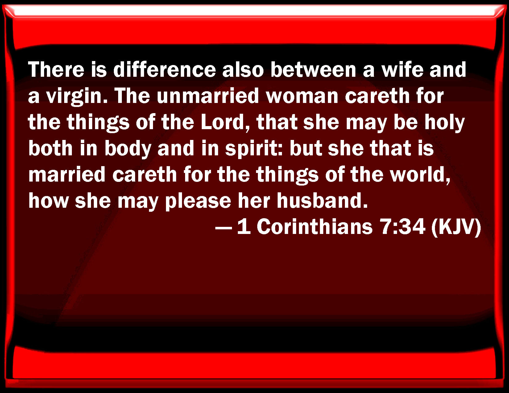 1 Corinthians 7:34 There is difference also between a wife and a virgin. The unmarried woman cares for the things of the Lord, that she may be holy both in body and in spirit: but she that is married cares for the things of the world, how she may please her husband.