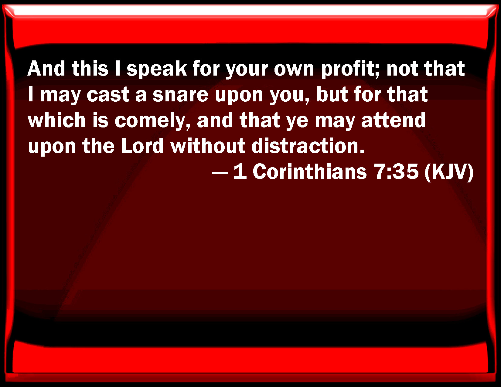 Bible Verse Slide 1 Corinthians 7:35 And this I speak for your own profit; not that I may cast a snare on you, but for that which is comely, and that you may attend on the Lord without distraction. KJV: And this I speak for your own profit; not that I may cast a snare upon you, but for that which is comely, and that ye may attend upon the Lord without distraction. DRB: And this I speak for your profit: not to cast a snare upon you; but for that which is decent, and which may give you power to attend upon the Lord, without impediment. DBT: But I say this for your own profit; not that I may set a snare before you, but for what is seemly, and waiting on the Lord without distraction. ERV: And this I say for your own profit; not that I may cast a snare upon you, but for that which is seemly, and that ye may attend upon the Lord without distraction. WBT: And this I speak for your own profit; not that I may cast a snare upon you, but for that which is comely, and that ye may attend upon the Lord without distraction. WEB: This I say for your own profit; not that I may ensnare you, but for that which is appropriate, and that you may attend to the Lord without distraction. YLT: And this for your own profit I say: not that I may cast a noose upon you, but for the seemliness and devotedness to the Lord, undistractedly,Links 1 Corinthians 7:35 NIV • 1 Corinthians 7:35 NLT • 1 Corinthians 7:35 ESV • 1 Corinthians 7:35 NASB • 1 Corinthians 7:35 KJV • 1 Corinthians 7:35 Interlinear • 1 Corinthians 7:35 Commentaries • 1 Corinthians 7:35 Parallel Texts • 1 Corinthians 7:35 Bible Apps • 1 Corinthians 7:35 Parallel • Bible Hub |