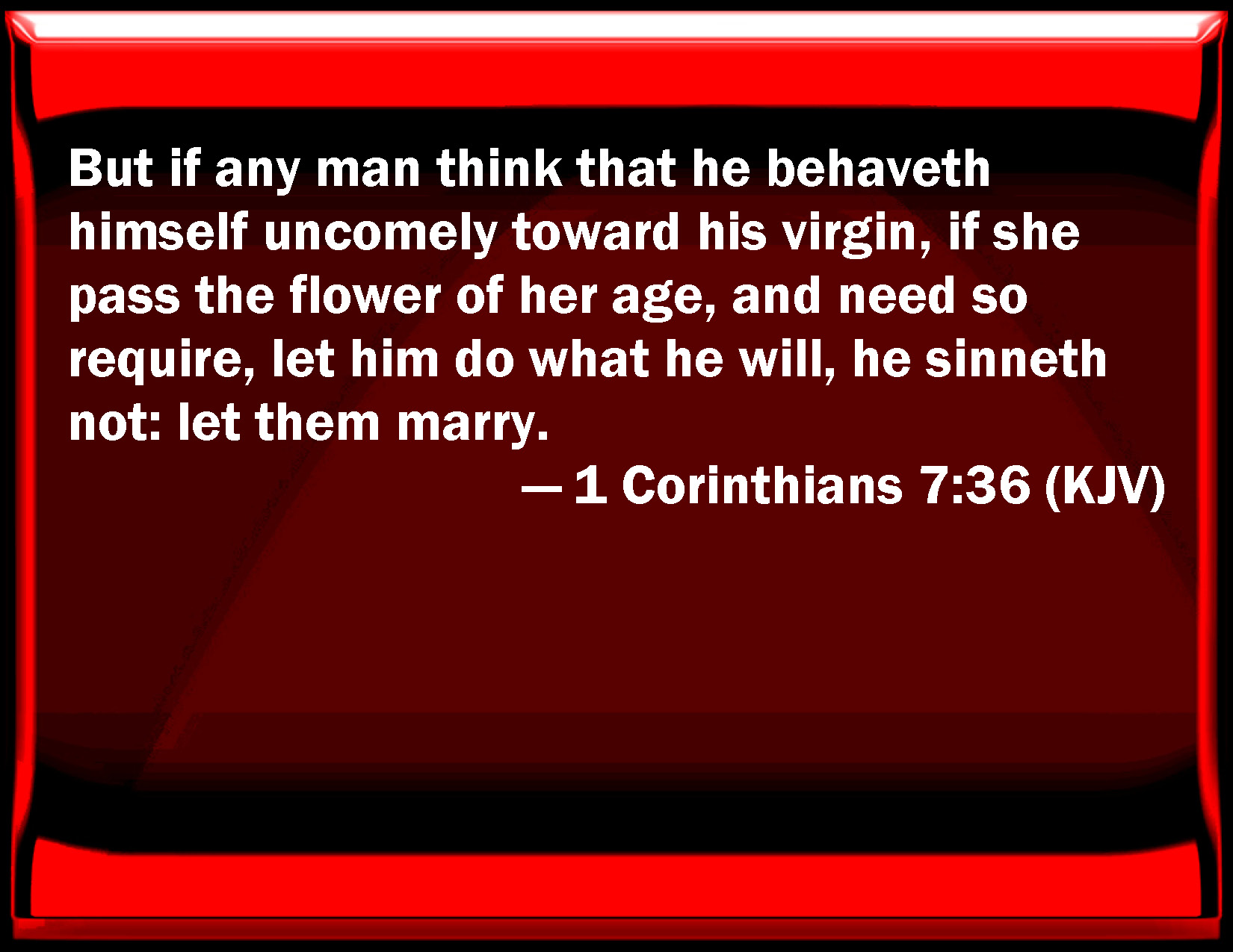 Bible Verse Slide 1 Corinthians 7:36 But if any man think that he behaves himself uncomely toward his virgin, if she pass the flower of her age, and need so require, let him do what he will, he sins not: let them marry. KJV: But if any man think that he behaveth himself uncomely toward his virgin, if she pass the flower of her age, and need so require, let him do what he will, he sinneth not: let them marry. DRB: But if any man think that he seemeth dishonoured, with regard to his virgin, for that she is above the age, and it must so be: let him do what he will; he sinneth not, if she marry. DBT: But if any one think that he behaves unseemly to his virginity, if he be beyond the flower of his age, and so it must be, let him do what he will, he does not sin: let them marry. ERV: But if any man thinketh that he behaveth himself unseemly toward his virgin daughter, if she be past the flower of her age, and if need so requireth, let him do what he will; he sinneth not; let them marry. WBT: But if any man thinketh that he behaveth himself uncomely towards his virgin, if she hath passed the flower of her age, and need so requireth, let him do what he will, he sinneth not: let them marry. WEB: But if any man thinks that he is behaving inappropriately toward his virgin, if she is past the flower of her age, and if need so requires, let him do what he desires. He doesn't sin. Let them marry. YLT: and if any one doth think it to be unseemly to his virgin, if she may be beyond the bloom of age, and it ought so to be, what he willeth let him do; he doth not sin — let him marry.Links 1 Corinthians 7:36 NIV • 1 Corinthians 7:36 NLT • 1 Corinthians 7:36 ESV • 1 Corinthians 7:36 NASB • 1 Corinthians 7:36 KJV • 1 Corinthians 7:36 Interlinear • 1 Corinthians 7:36 Commentaries • 1 Corinthians 7:36 Parallel Texts • 1 Corinthians 7:36 Bible Apps • 1 Corinthians 7:36 Parallel • Bible Hub |
