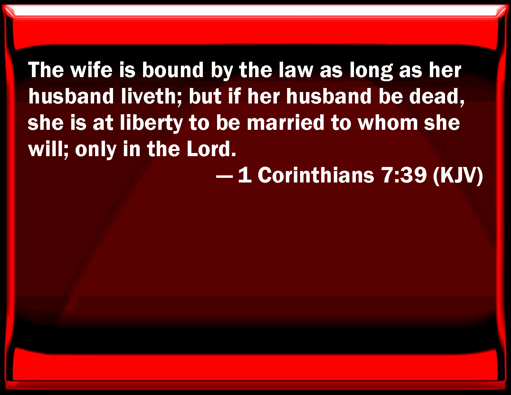 Bible Verse Slide 1 Corinthians 7:39 The wife is bound by the law as long as her husband lives; but if her husband be dead, she is at liberty to be married to whom she will; only in the Lord. KJV: The wife is bound by the law as long as her husband liveth; but if her husband be dead, she is at liberty to be married to whom she will; only in the Lord. DRB: A woman is bound by the law as long as her husband liveth; but if her husband die, she is at liberty: let her marry to whom she will; only in the Lord. DBT: A wife is bound for whatever time her husband lives; but if the husband be fallen asleep, she is free to be married to whom she will, only in the Lord. ERV: A wife is bound for so long time as her husband liveth; but if the husband be dead, she is free to be married to whom she will; only in the Lord. WBT: The wife is bound by the law as long as her husband liveth; but if her husband is dead, she is at liberty to be married to whom she will; only in the Lord. WEB: A wife is bound by law for as long as her husband lives; but if the husband is dead, she is free to be married to whoever she desires, only in the Lord. YLT: A wife hath been bound by law as long time as her husband may live, and if her husband may sleep, she is free to be married to whom she will — only in the Lord;Links 1 Corinthians 7:39 NIV • 1 Corinthians 7:39 NLT • 1 Corinthians 7:39 ESV • 1 Corinthians 7:39 NASB • 1 Corinthians 7:39 KJV • 1 Corinthians 7:39 Interlinear • 1 Corinthians 7:39 Commentaries • 1 Corinthians 7:39 Parallel Texts • 1 Corinthians 7:39 Bible Apps • 1 Corinthians 7:39 Parallel • Bible Hub |