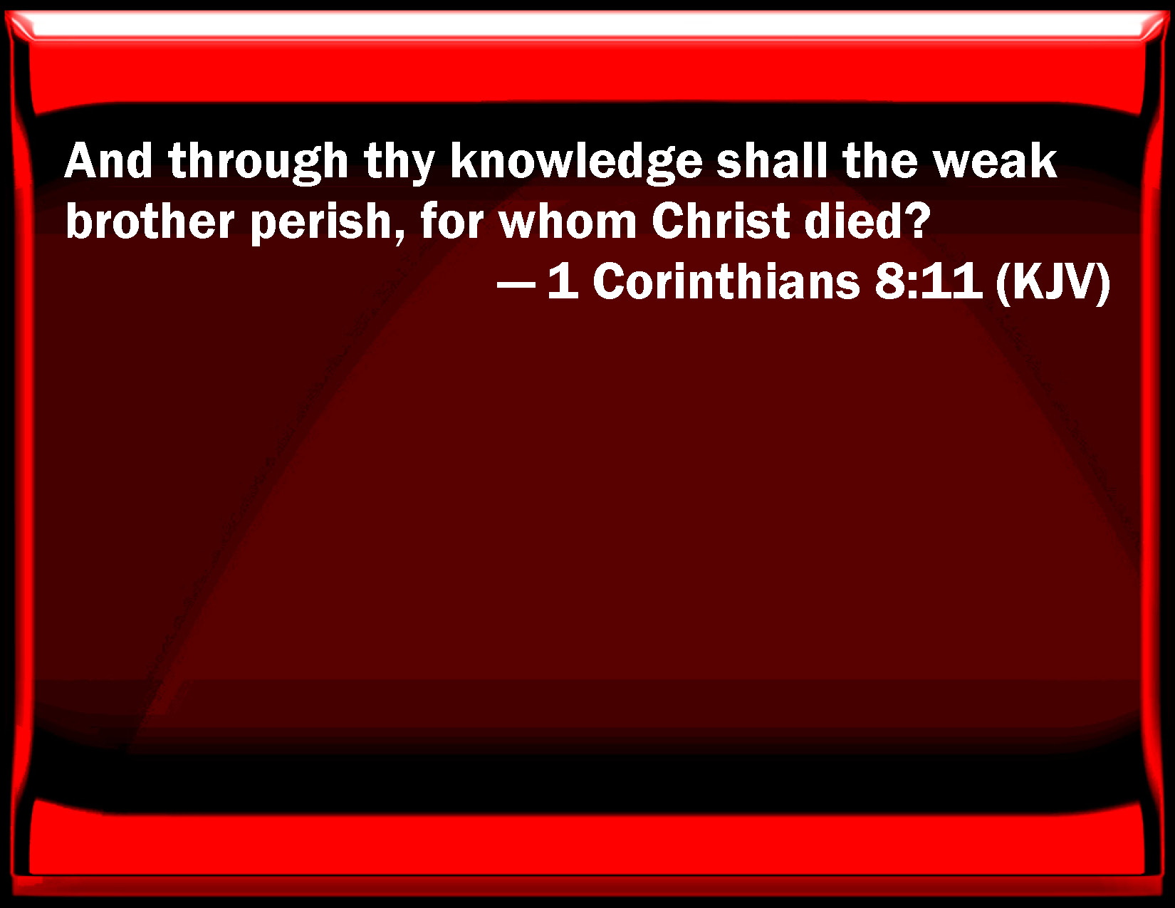 Bible Verse Slide 1 Corinthians 8:11 And through your knowledge shall the weak brother perish, for whom Christ died? KJV: And through thy knowledge shall the weak brother perish, for whom Christ died? DRB: And through thy knowledge shall the weak brother perish, for whom Christ hath died ? DBT: and the weak one, the brother for whose sake Christ died, will perish through thy knowledge. ERV: For through thy knowledge he that is weak perisheth, the brother for whose sake Christ died. WBT: And through thy knowledge shall the weak brother perish, for whom Christ died? WEB: And through your knowledge, he who is weak perishes, the brother for whose sake Christ died. YLT: and the brother who is infirm shall perish by thy knowledge, because of whom Christ died?Links 1 Corinthians 8:11 NIV • 1 Corinthians 8:11 NLT • 1 Corinthians 8:11 ESV • 1 Corinthians 8:11 NASB • 1 Corinthians 8:11 KJV • 1 Corinthians 8:11 Interlinear • 1 Corinthians 8:11 Commentaries • 1 Corinthians 8:11 Parallel Texts • 1 Corinthians 8:11 Bible Apps • 1 Corinthians 8:11 Parallel • Bible Hub |
