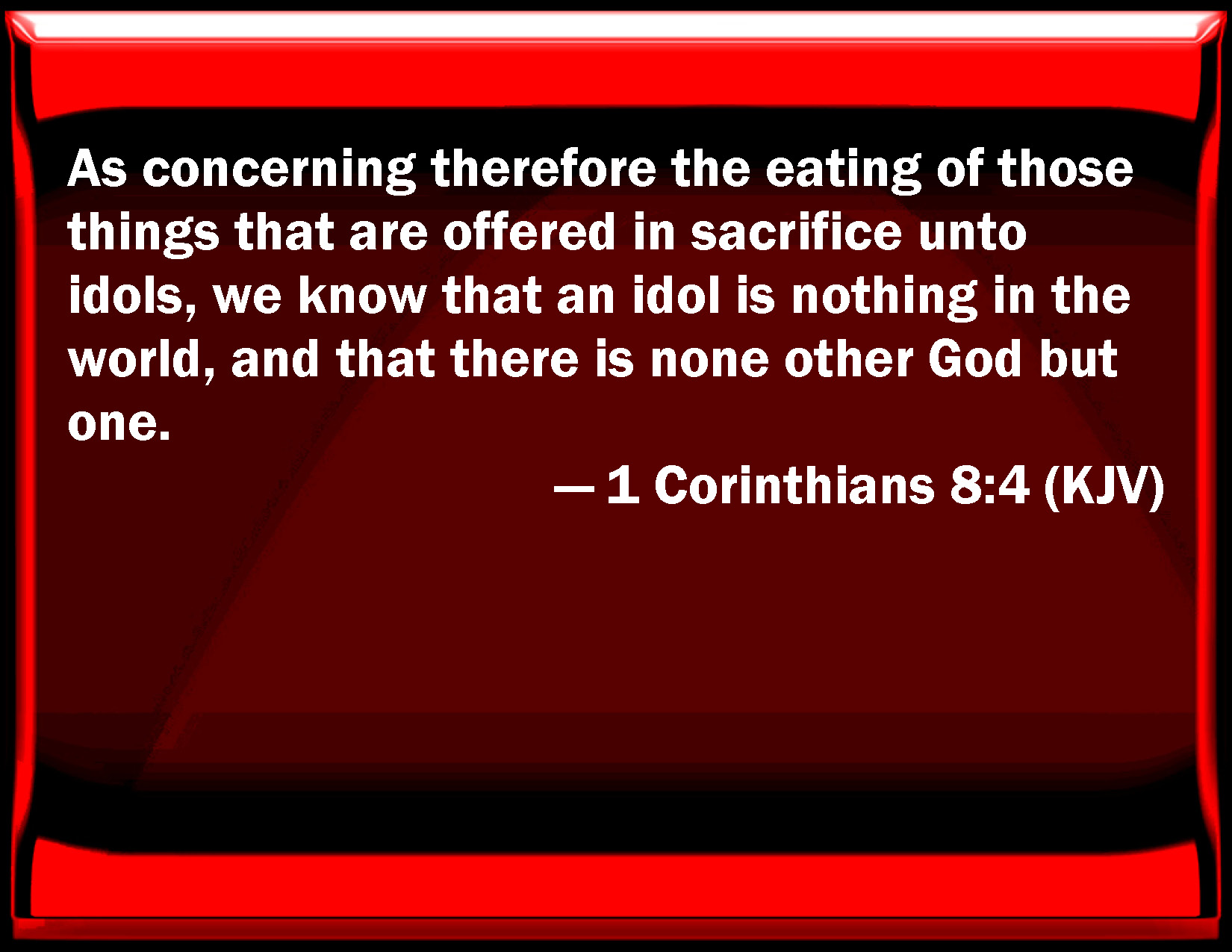 Bible Verse Slide 1 Corinthians 8:4 As concerning therefore the eating of those things that are offered in sacrifice to idols, we know that an idol is nothing in the world, and that there is none other God but one. KJV: As concerning therefore the eating of those things that are offered in sacrifice unto idols, we know that an idol is nothing in the world, and that there is none other God but one. DRB: But as for the meats that are sacrificed to idols, we know that an idol is nothing in the world, and that there is no God but one. DBT: concerning then the eating of things sacrificed to idols, we know that an idol is nothing in the world, and that there is no other God save one. ERV: Concerning therefore the eating of things sacrificed to idols, we know that no idol is anything in the world, and that there is no God but one. WBT: Therefore as concerning the eating of those things that are offered in sacrifice to idols, we know that an idol is nothing in the world, and that there is no other God but one. WEB: Therefore concerning the eating of things sacrificed to idols, we know that no idol is anything in the world, and that there is no other God but one. YLT: Concerning the eating then of the things sacrificed to idols, we have known that an idol is nothing in the world, and that there is no other God except one;Links 1 Corinthians 8:4 NIV • 1 Corinthians 8:4 NLT • 1 Corinthians 8:4 ESV • 1 Corinthians 8:4 NASB • 1 Corinthians 8:4 KJV • 1 Corinthians 8:4 Interlinear • 1 Corinthians 8:4 Commentaries • 1 Corinthians 8:4 Parallel Texts • 1 Corinthians 8:4 Bible Apps • 1 Corinthians 8:4 Parallel • Bible Hub |