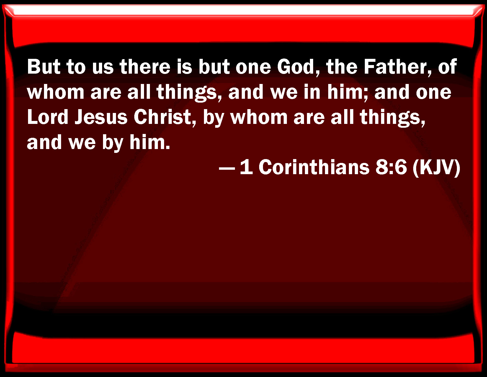 Bible Verse Slide 1 Corinthians 8:6 But to us there is but one God, the Father, of whom are all things, and we in him; and one Lord Jesus Christ, by whom are all things, and we by him. KJV: But to us there is but one God, the Father, of whom are all things, and we in him; and one Lord Jesus Christ, by whom are all things, and we by him. DRB: Yet to us there is but one God, the Father, of whom are all things, and we unto him; and one Lord Jesus Christ, by whom are all things, and we by him. DBT: yet to us there is one God, the Father, of whom all things, and we for him; and one Lord, Jesus Christ, by whom are all things, and we by him. ERV: yet to us there is one God, the Father, of whom are all things, and we unto him; and one Lord, Jesus Christ, through whom are all things, and we through him. WBT: Yet to us there is but one God, the Father, from whom are all things, and we in him; and one Lord Jesus Christ, by whom are all things, and we by him. WEB: yet to us there is one God, the Father, of whom are all things, and we for him; and one Lord, Jesus Christ, through whom are all things, and we live through him. YLT: yet to us is one God, the Father, of whom are the all things, and we to Him; and one Lord, Jesus Christ, through whom are the all things, and we through Him;Links 1 Corinthians 8:6 NIV • 1 Corinthians 8:6 NLT • 1 Corinthians 8:6 ESV • 1 Corinthians 8:6 NASB • 1 Corinthians 8:6 KJV • 1 Corinthians 8:6 Interlinear • 1 Corinthians 8:6 Commentaries • 1 Corinthians 8:6 Parallel Texts • 1 Corinthians 8:6 Bible Apps • 1 Corinthians 8:6 Parallel • Bible Hub |
