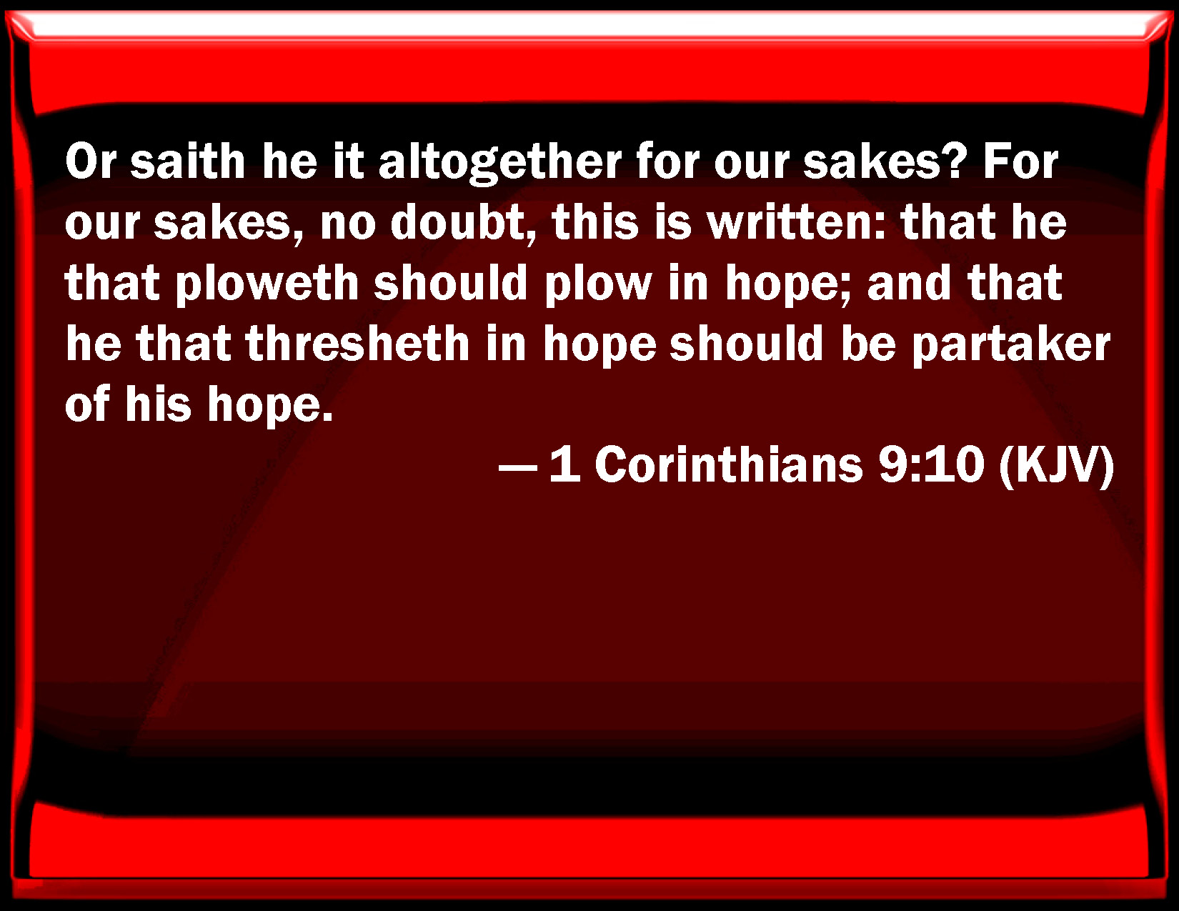 Bible Verse Slide 1 Corinthians 9:10 Or said he it altogether for our sakes? For our sakes, no doubt, this is written: that he that plows should plow in hope; and that he that threshes in hope should be partaker of his hope. KJV: Or saith he it altogether for our sakes? For our sakes, no doubt, this is written: that he that ploweth should plow in hope; and that he that thresheth in hope should be partaker of his hope. DRB: Or doth he say this indeed for our sakes? For these things are written for our sakes: that he that plougheth, should plough in hope; and he that thrasheth, in hope to receive fruit. DBT: or does he say it altogether for our sakes? For for our sakes it has been written, that the plougher should plough in hope, and he that treads out corn, in hope of partaking of it. ERV: or saith he it altogether for our sake? Yea, for our sake it was written: because he that ploweth ought to plow in hope, and he that thresheth, to thresh in hope of partaking. WBT: Or saith he this altogether for our sakes? for our sakes, no doubt, this is written: that he that ploweth should plow in hope; and that he that thresheth in hope should be partaker of his hope. WEB: or does he say it assuredly for our sake? Yes, it was written for our sake, because he who plows ought to plow in hope, and he who threshes in hope should partake of his hope. YLT: or because of us by all means doth He say it? yes, because of us it was written, because in hope ought the plower to plow, and he who is treading ought of his hope to partake in hope.Links 1 Corinthians 9:10 NIV • 1 Corinthians 9:10 NLT • 1 Corinthians 9:10 ESV • 1 Corinthians 9:10 NASB • 1 Corinthians 9:10 KJV • 1 Corinthians 9:10 Interlinear • 1 Corinthians 9:10 Commentaries • 1 Corinthians 9:10 Parallel Texts • 1 Corinthians 9:10 Bible Apps • 1 Corinthians 9:10 Parallel • Bible Hub |