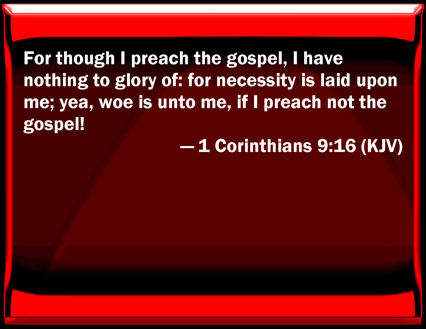 Bible Verse Slide 1 Corinthians 9:16 For though I preach the gospel, I have nothing to glory of: for necessity is laid on me; yes, woe is to me, if I preach not the gospel! KJV: For though I preach the gospel, I have nothing to glory of: for necessity is laid upon me; yea, woe is unto me, if I preach not the gospel! DRB: For if I preach the gospel, it is no glory to me, for a necessity lieth upon me: for woe is unto me if I preach not the gospel. DBT: For if I announce the glad tidings, I have nothing to boast of; for a necessity is laid upon me; for it is woe to me if I should not announce the glad tidings. ERV: For if I preach the gospel, I have nothing to glory of; for necessity is laid upon me; for woe is unto me, if I preach not the gospel. WBT: For though I preach the gospel, I have nothing to boast of: for necessity is laid upon me; and woe is to me, if I preach not the gospel! WEB: For if I preach the Good News, I have nothing to boast about; for necessity is laid on me; but woe is to me, if I don't preach the Good News. YLT: for if I may proclaim good news, it is no glorying for me, for necessity is laid upon me, and woe is to me if I may not proclaim good news;Links 1 Corinthians 9:16 NIV • 1 Corinthians 9:16 NLT • 1 Corinthians 9:16 ESV • 1 Corinthians 9:16 NASB • 1 Corinthians 9:16 KJV • 1 Corinthians 9:16 Interlinear • 1 Corinthians 9:16 Commentaries • 1 Corinthians 9:16 Parallel Texts • 1 Corinthians 9:16 Bible Apps • 1 Corinthians 9:16 Parallel • Bible Hub |