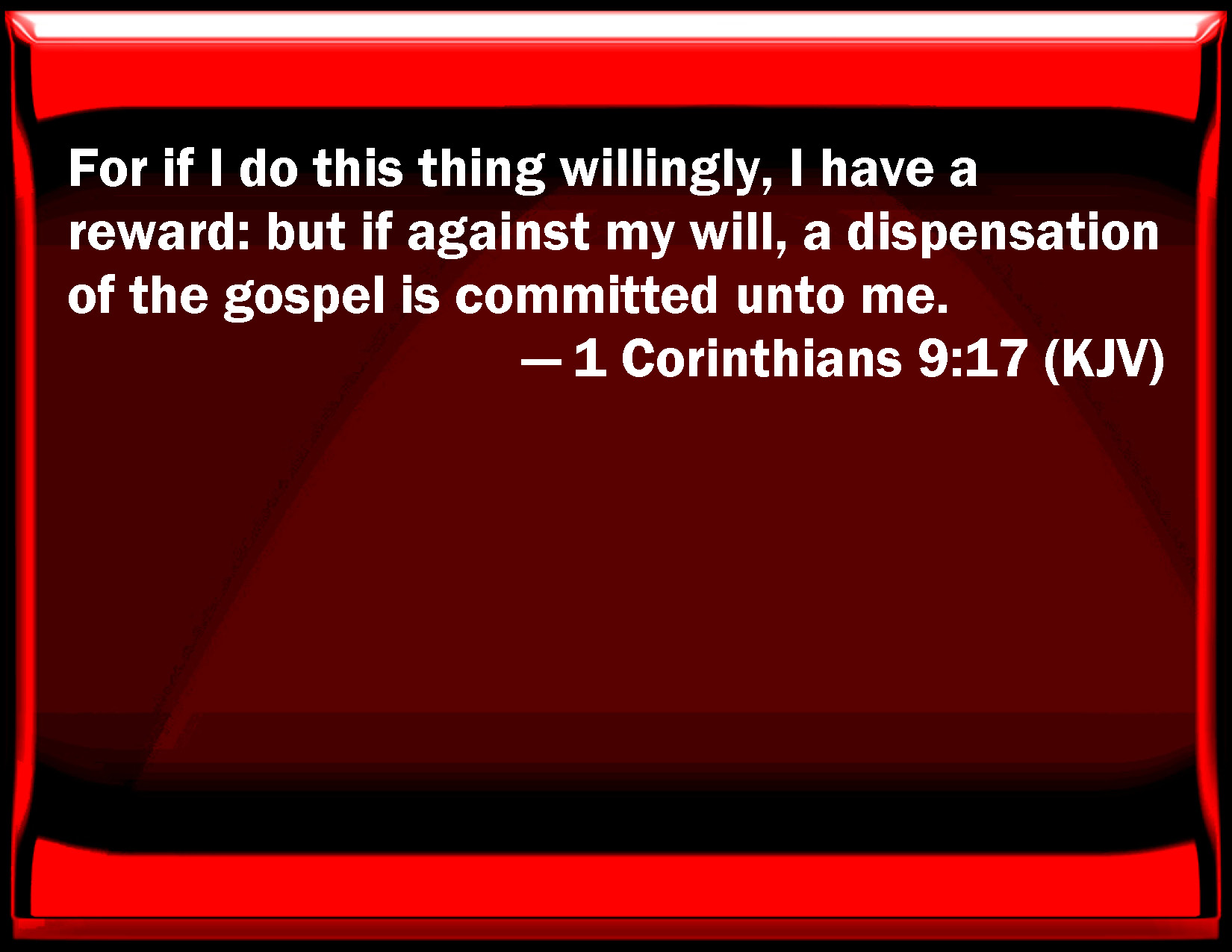 Bible Verse Slide 1 Corinthians 9:17 For if I do this thing willingly, I have a reward: but if against my will, a dispensation of the gospel is committed to me. KJV: For if I do this thing willingly, I have a reward: but if against my will, a dispensation of the gospel is committed unto me. DRB: For if I do this thing willingly, I have a reward: but if against my will, a dispensation is committed to me: DBT: For if I do this voluntarily, I have a reward; but if not of my own will, I am entrusted with an administration. ERV: For if I do this of mine own will, I have a reward: but if not of mine own will, I have a stewardship intrusted to me. WBT: For if I do this thing willingly, I have a reward: but if against my will, a dispensation of the gospel is committed to me. WEB: For if I do this of my own will, I have a reward. But if not of my own will, I have a stewardship entrusted to me. YLT: for if willing I do this, I have a reward; and if unwillingly — with a stewardship I have been entrusted!Links 1 Corinthians 9:17 NIV • 1 Corinthians 9:17 NLT • 1 Corinthians 9:17 ESV • 1 Corinthians 9:17 NASB • 1 Corinthians 9:17 KJV • 1 Corinthians 9:17 Interlinear • 1 Corinthians 9:17 Commentaries • 1 Corinthians 9:17 Parallel Texts • 1 Corinthians 9:17 Bible Apps • 1 Corinthians 9:17 Parallel • Bible Hub |