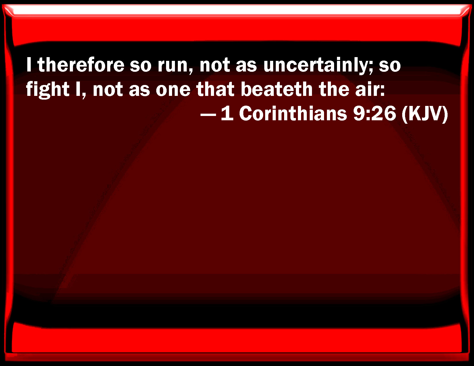 Bible Verse Slide 1 Corinthians 9:26 I therefore so run, not as uncertainly; so fight I, not as one that beats the air: KJV: I therefore so run, not as uncertainly; so fight I, not as one that beateth the air: DRB: I therefore so run, not as at an uncertainty: I so fight, not as one beating the air: DBT: I therefore thus run, as not uncertainly; so I combat, as not beating the air. ERV: I therefore so run, as not uncertainly; so fight I, as not beating the air: WBT: I therefore so run, not as uncertainly; so I fight, not as one that beateth the air: WEB: I therefore run like that, as not uncertainly. I fight like that, as not beating the air, YLT: I, therefore, thus run, not as uncertainly, thus I fight, as not beating air;Links 1 Corinthians 9:26 NIV • 1 Corinthians 9:26 NLT • 1 Corinthians 9:26 ESV • 1 Corinthians 9:26 NASB • 1 Corinthians 9:26 KJV • 1 Corinthians 9:26 Interlinear • 1 Corinthians 9:26 Commentaries • 1 Corinthians 9:26 Parallel Texts • 1 Corinthians 9:26 Bible Apps • 1 Corinthians 9:26 Parallel • Bible Hub |