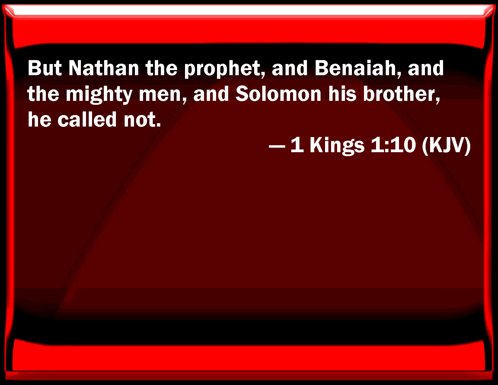 Bible Verse Slide 1 Kings 1:10 But Nathan the prophet, and Benaiah, and the mighty men, and Solomon his brother, he called not. KJV: But Nathan the prophet, and Benaiah, and the mighty men, and Solomon his brother, he called not. DRB: But Nathan the prophet, and Banaias, and all the valiant men, and Solomon his brother, he invited not. DBT: but Nathan the prophet, and Benaiah, and the mighty men, and Solomon his brother, he did not invite. ERV: but Nathan the prophet, and Benaiah, and the mighty men, and Solomon his brother, he called not. WBT: But Nathan the prophet, and Benaiah, and the mighty men, and Solomon his brother, he called not. WEB: but Nathan the prophet, and Benaiah, and the mighty men, and Solomon his brother, he didn't call. YLT: and Nathan the prophet, and Benaiah, and the mighty ones, and Solomon his brother, he hath not called.Links 1 Kings 1:10 NIV • 1 Kings 1:10 NLT • 1 Kings 1:10 ESV • 1 Kings 1:10 NASB • 1 Kings 1:10 KJV • 1 Kings 1:10 Interlinear • 1 Kings 1:10 Commentaries • 1 Kings 1:10 Parallel Texts • 1 Kings 1:10 Bible Apps • 1 Kings 1:10 Parallel • Bible Hub |