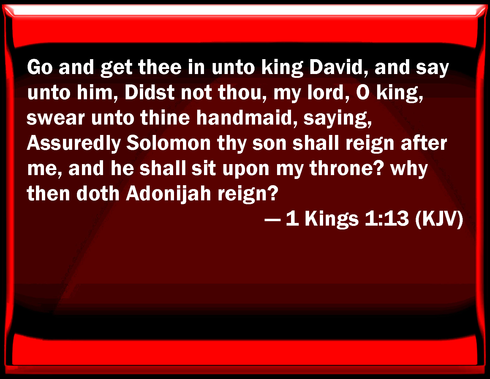 Bible Verse Slide 1 Kings 1:13 Go and get you in to king David, and say to him, Did not you, my lord, O king, swear to your handmaid, saying, Assuredly Solomon your son shall reign after me, and he shall sit on my throne? why then does Adonijah reign? KJV: Go and get thee in unto king David, and say unto him, Didst not thou, my lord, O king, swear unto thine handmaid, saying, Assuredly Solomon thy son shall reign after me, and he shall sit upon my throne? why then doth Adonijah reign? DRB: Go, and get thee in to king David, and say to him: Didst not thou, my lord O king, swear to me thy handmaid, saying: Solomon thy son shall reign after me, and he shall sit on my throne? why then doth Adonias reign? DBT: Go and get thee in to king David, and say to him, Didst not thou, my lord, O king, swear to thy handmaid saying, Solomon thy son shall reign after me, and he shall sit on my throne? why then does Adonijah reign? ERV: Go and get thee in unto king David, and say unto him, Didst not thou, my lord, O king, swear unto thine handmaid, saying, Assuredly Solomon thy son shall reign after me, and he shall sit upon my throne? why then doth Adonijah reign? WBT: Go, and enter in to king David, and say to him, Didst not thou, my lord, O king, swear to thy handmaid, saying, Assuredly Solomon thy son shall reign after me, and he shall sit upon my throne? why then doth Adonijah reign? WEB: Go in to king David, and tell him, 'Didn't you, my lord, king, swear to your handmaid, saying, Assuredly Solomon your son shall reign after me, and he shall sit on my throne? Why then does Adonijah reign?' YLT: go and enter in unto king David, and thou hast said unto him, Hast thou not, my lord, O king, sworn to thy handmaid, saying, Surely Solomon thy son doth reign after me, and he doth sit on my throne? and wherefore hath Adonijah reigned?Links 1 Kings 1:13 NIV • 1 Kings 1:13 NLT • 1 Kings 1:13 ESV • 1 Kings 1:13 NASB • 1 Kings 1:13 KJV • 1 Kings 1:13 Interlinear • 1 Kings 1:13 Commentaries • 1 Kings 1:13 Parallel Texts • 1 Kings 1:13 Bible Apps • 1 Kings 1:13 Parallel • Bible Hub |
