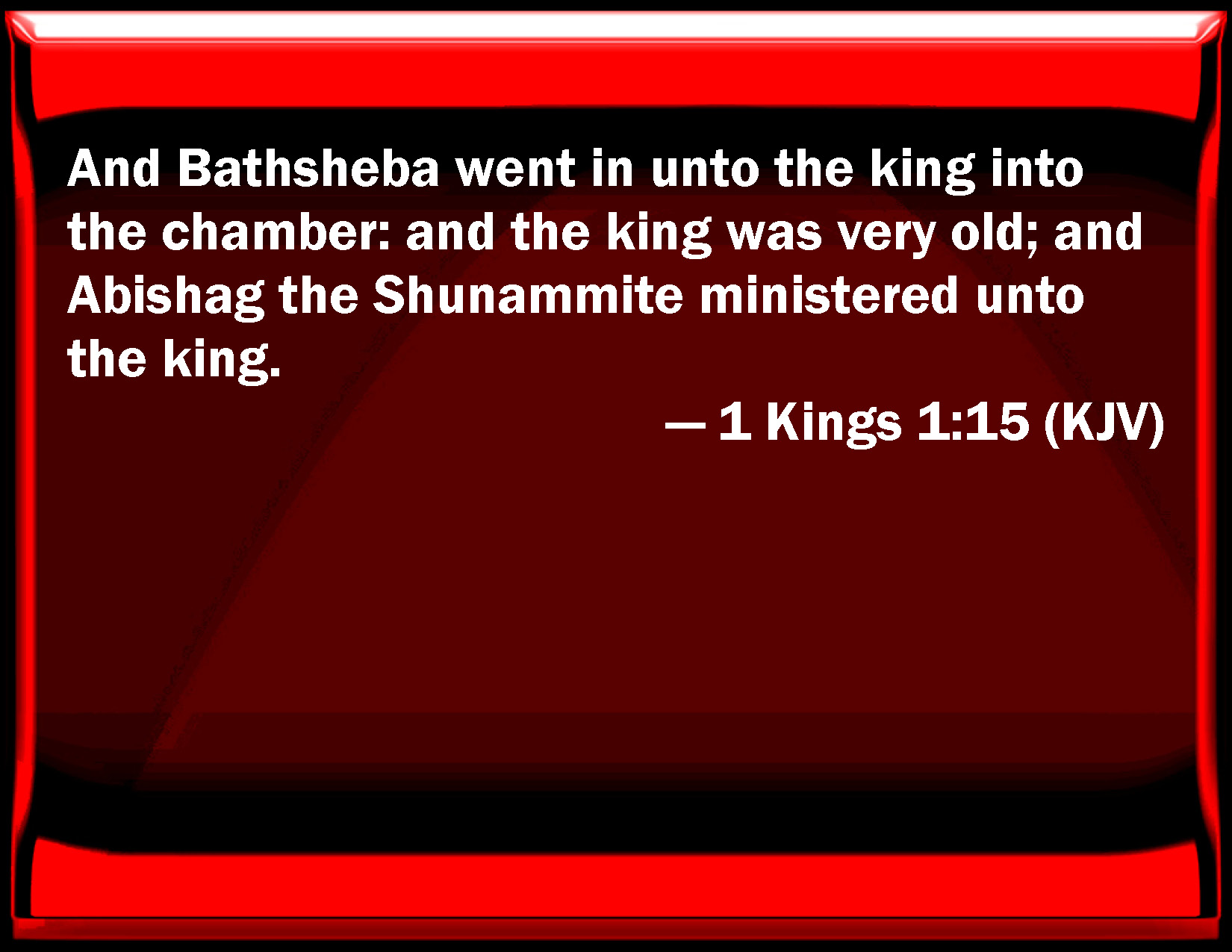 1 Kings 1:15 And Bathsheba went in to the king into the chamber: and the king was very old; and Abishag the Shunammite ministered to the king.