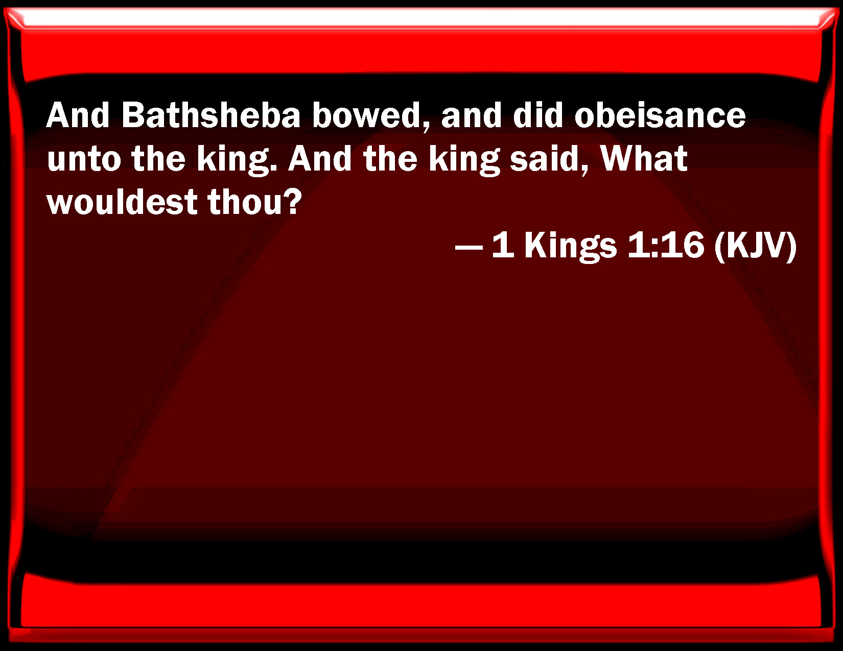 Bible Verse Slide 1 Kings 1:16 And Bathsheba bowed, and did obeisance to the king. And the king said, What would you? KJV: And Bathsheba bowed, and did obeisance unto the king. And the king said, What wouldest thou? DRB: Bethsabee bowed herself, and worshipped the king. And the king said to her: What is thy will? DBT: And Bathsheba bowed and did obeisance to the king. And the king said, What wouldest thou? ERV: And Bath-sheba bowed, and did obeisance unto the king. And the king said, What wouldest thou? WBT: And Bath-sheba bowed, and did obeisance to the king. And the king said, What wouldst thou? WEB: Bathsheba bowed, and did obeisance to the king. The king said, "What would you like?" YLT: and Bath-Sheba boweth and doth obeisance to the king, and the king saith, 'What — to thee?'Links 1 Kings 1:16 NIV • 1 Kings 1:16 NLT • 1 Kings 1:16 ESV • 1 Kings 1:16 NASB • 1 Kings 1:16 KJV • 1 Kings 1:16 Interlinear • 1 Kings 1:16 Commentaries • 1 Kings 1:16 Parallel Texts • 1 Kings 1:16 Bible Apps • 1 Kings 1:16 Parallel • Bible Hub |
