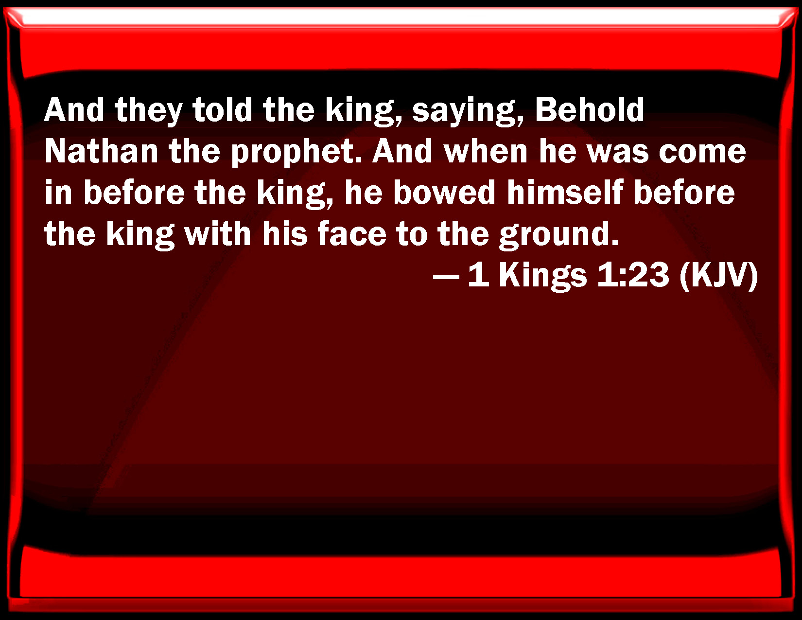 Bible Verse Slide 1 Kings 1:23 And they told the king, saying, Behold Nathan the prophet. And when he was come in before the king, he bowed himself before the king with his face to the ground. KJV: And they told the king, saying, Behold Nathan the prophet. And when he was come in before the king, he bowed himself before the king with his face to the ground. DRB: And they told the king, saying: Nathan the prophet is here. And when he was come in before the king, and had worshipped, bowing down to the ground, DBT: And they told the king saying, Behold, Nathan the prophet. And when he was come in before the king, he bowed himself before the king with his face to the ground. ERV: And they told the king, saying, Behold, Nathan the prophet. And when he was come in before the king, he bowed himself before the king with his face to the ground. WBT: And they told the king, saying, Behold, Nathan the prophet. And when he had come in before the king, he bowed himself before the king with his face to the ground. WEB: They told the king, saying, "Behold, Nathan the prophet!" When he had come in before the king, he bowed himself before the king with his face to the ground. YLT: and they declare to the king, saying, 'Lo, Nathan the prophet;' and he cometh in before the king, and boweth himself to the king, on his face to the earth.Links 1 Kings 1:23 NIV • 1 Kings 1:23 NLT • 1 Kings 1:23 ESV • 1 Kings 1:23 NASB • 1 Kings 1:23 KJV • 1 Kings 1:23 Interlinear • 1 Kings 1:23 Commentaries • 1 Kings 1:23 Parallel Texts • 1 Kings 1:23 Bible Apps • 1 Kings 1:23 Parallel • Bible Hub |