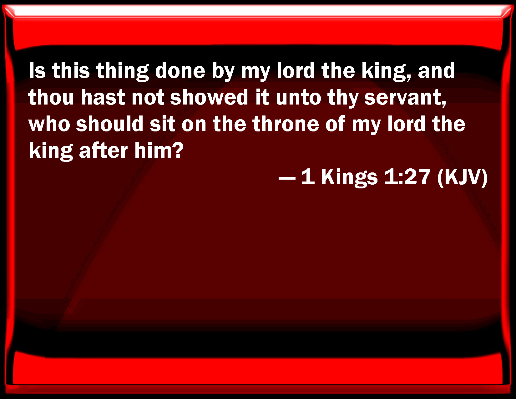 Bible Verse Slide 1 Kings 1:27 Is this thing done by my lord the king, and you have not showed it to your servant, who should sit on the throne of my lord the king after him? KJV: Is this thing done by my lord the king, and thou hast not shewed it unto thy servant, who should sit on the throne of my lord the king after him? DRB: Is this word come out from my lord the king, and hast thou not told me thy servant who should sit on the throne of my lord the king after him? DBT: Is this thing done by my lord the king, and thou hast not shewn to thy servants who should sit on the throne of my lord the king after him? ERV: Is this thing done by my lord the king, and thou hast not shewed unto thy servants who should sit on the throne of my lord the king after him? WBT: Is this thing done by my lord the king, and thou hast not shown it to thy servant, who should sit on the throne of my lord the king after him? WEB: Is this thing done by my lord the king, and you haven't shown to your servants who should sit on the throne of my lord the king after him?" YLT: if from my lord the king this thing hath been, then thou hast not caused thy servant to know who doth sit on the throne of my lord the king after him.'Links 1 Kings 1:27 NIV • 1 Kings 1:27 NLT • 1 Kings 1:27 ESV • 1 Kings 1:27 NASB • 1 Kings 1:27 KJV • 1 Kings 1:27 Interlinear • 1 Kings 1:27 Commentaries • 1 Kings 1:27 Parallel Texts • 1 Kings 1:27 Bible Apps • 1 Kings 1:27 Parallel • Bible Hub |