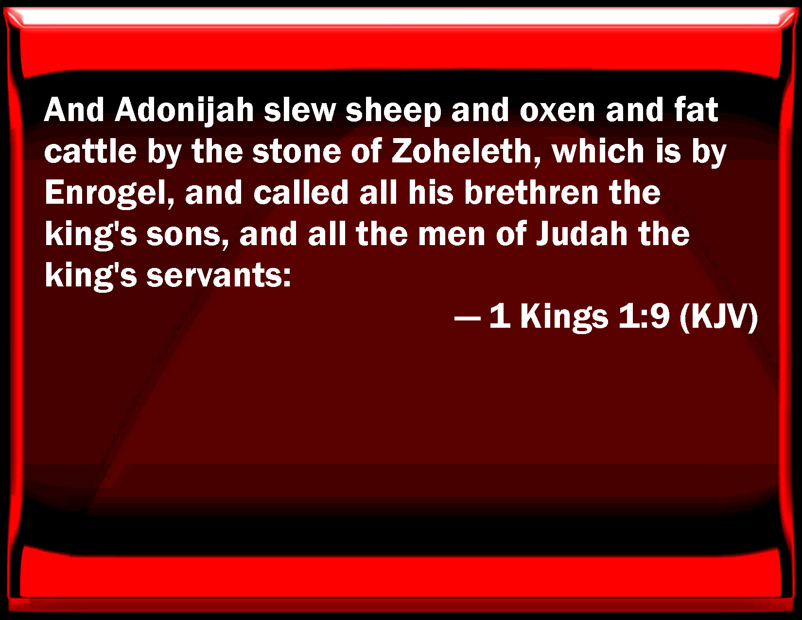 Bible Verse Slide 1 Kings 1:9 And Adonijah slew sheep and oxen and fat cattle by the stone of Zoheleth, which is by Enrogel, and called all his brothers the king's sons, and all the men of Judah the king's servants: KJV: And Adonijah slew sheep and oxen and fat cattle by the stone of Zoheleth, which is by Enrogel, and called all his brethren the king's sons, and all the men of Judah the king's servants: DRB: And Adonias having slain rams and calves, and all fat cattle by the stone of Zoheleth, which was near the fountain Rogel, invited all his brethren the king's sons, and all the men of Juda, the king's servants: DBT: And Adonijah sacrificed sheep and oxen and fatted cattle by the stone of Zoheleth, which is by En-rogel, and invited all his brethren, the king's sons, and all the men of Judah, the king's servants; ERV: And Adonijah slew sheep and oxen and fatlings by the stone of Zoheleth, which is beside En-rogel; and he called all his brethren the king's sons, and all the men of Judah the king's servants: WBT: And Adonijah slew sheep, and oxen, and fat cattle, by the stone of Zoheleth, which is by En-rogel, and called all his brethren the king's sons, and all the men of Judah the king's servants: WEB: Adonijah killed sheep and cattle and fatlings by the stone of Zoheleth, which is beside En Rogel; and he called all his brothers, the king's sons, and all the men of Judah, the king's servants: YLT: And Adonijah sacrificeth sheep and oxen and fatlings near the stone of Zoheleth, that is by En-Rogel, and calleth all his brethren, sons of the king, and for all the men of Judah, servants of the king;Links 1 Kings 1:9 NIV • 1 Kings 1:9 NLT • 1 Kings 1:9 ESV • 1 Kings 1:9 NASB • 1 Kings 1:9 KJV • 1 Kings 1:9 Interlinear • 1 Kings 1:9 Commentaries • 1 Kings 1:9 Parallel Texts • 1 Kings 1:9 Bible Apps • 1 Kings 1:9 Parallel • Bible Hub |