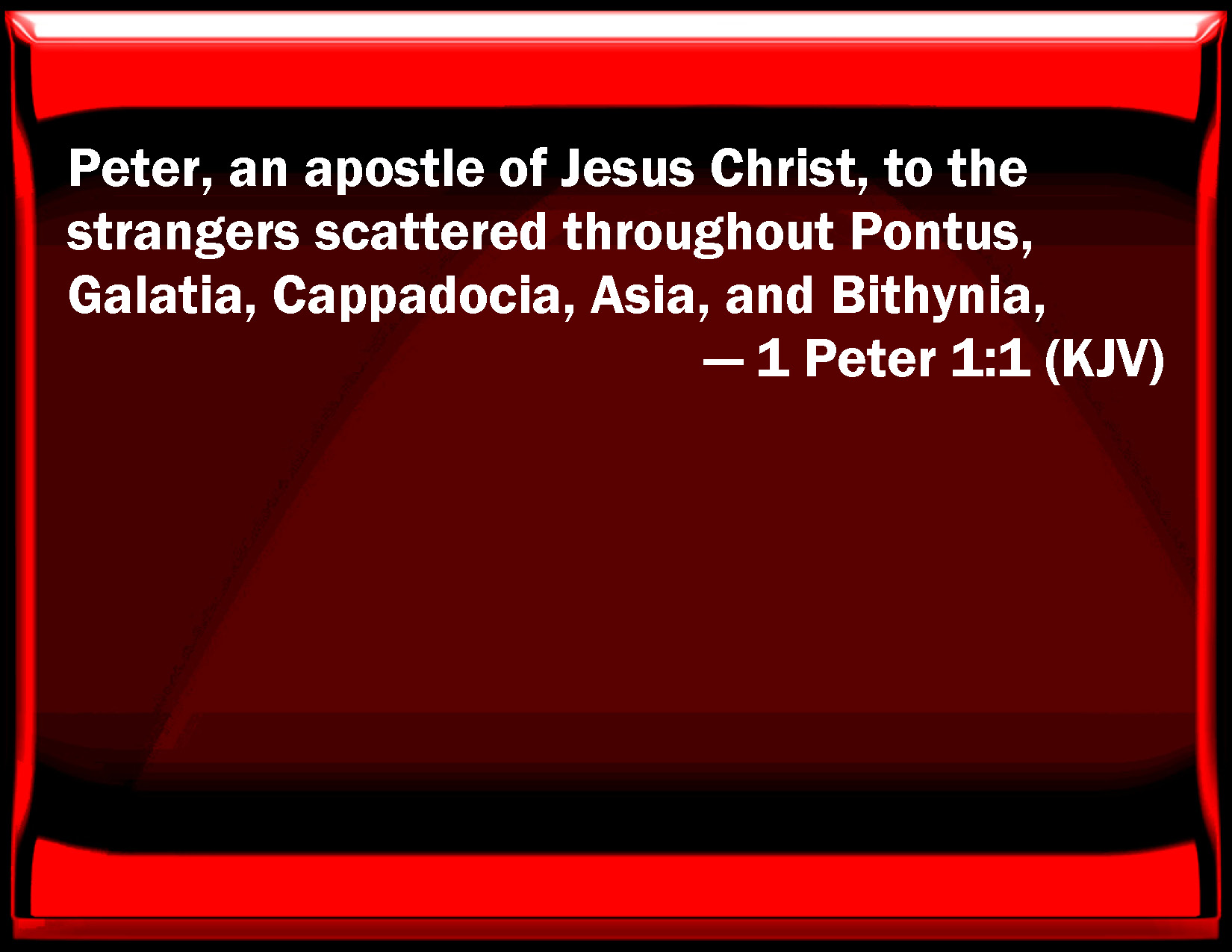 Bible Verse Slide 1 Peter 1:1 Peter, an apostle of Jesus Christ, to the strangers scattered throughout Pontus, Galatia, Cappadocia, Asia, and Bithynia, KJV: Peter, an apostle of Jesus Christ, to the strangers scattered throughout Pontus, Galatia, Cappadocia, Asia, and Bithynia, DRB: Peter, an apostle of Jesus Christ, to the strangers dispersed through Pontus, Galatia, Cappadocia, Asia, and Bithynia, elect, DBT: Peter, apostle of Jesus Christ, to the sojourners of the dispersion of Pontus, Galatia, Cappadocia, Asia, and Bithynia, ERV: Peter, an apostle of Jesus Christ, to the elect who are sojourners of the Dispersion in Pontus, Galatia, Cappadocia, Asia, and Bithynia, WBT: Peter, an apostle of Jesus Christ, to the strangers scattered throughout Pontus, Galatia, Cappadocia, Asia, and Bithynia, WEB: Peter, an apostle of Jesus Christ, to the chosen ones who are living as foreigners in the Dispersion in Pontus, Galatia, Cappadocia, Asia, and Bithynia, YLT: Peter, an apostle of Jesus Christ, to the choice sojourners of the dispersion of Pontus, Galatia, Cappadocia, Asia, and Bithynia,Links 1 Peter 1:1 NIV • 1 Peter 1:1 NLT • 1 Peter 1:1 ESV • 1 Peter 1:1 NASB • 1 Peter 1:1 KJV • 1 Peter 1:1 Interlinear • 1 Peter 1:1 Commentaries • 1 Peter 1:1 Parallel Texts • 1 Peter 1:1 Bible Apps • 1 Peter 1:1 Parallel • Bible Hub |