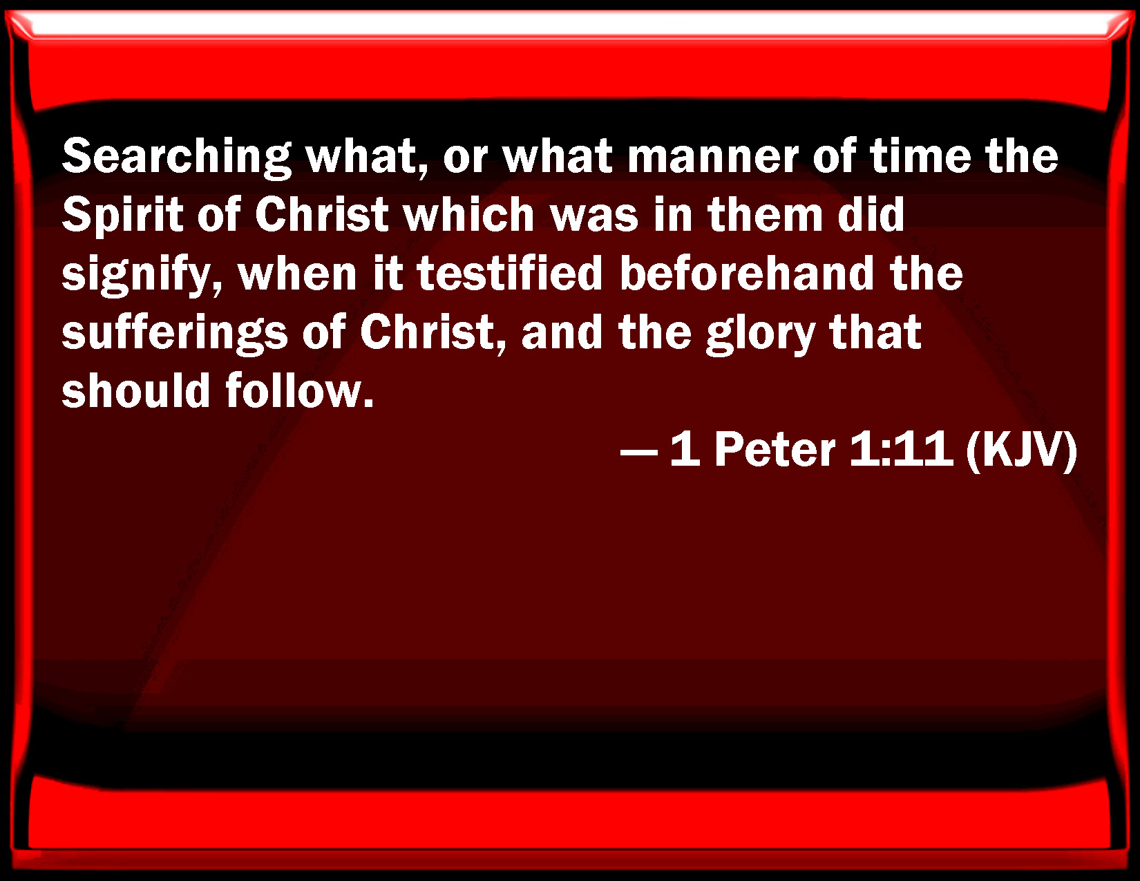Bible Verse Slide 1 Peter 1:11 Searching what, or what manner of time the Spirit of Christ which was in them did signify, when it testified beforehand the sufferings of Christ, and the glory that should follow. KJV: Searching what, or what manner of time the Spirit of Christ which was in them did signify, when it testified beforehand the sufferings of Christ, and the glory that should follow. DRB: Searching what or what manner of time the Spirit of Christ in them did signify: when it foretold those sufferings that are in Christ, and the glories that should follow: DBT: searching what, or what manner of time, the Spirit of Christ which was in them pointed out, testifying before of the sufferings which belonged to Christ, and the glories after these. ERV: searching what time or what manner of time the Spirit of Christ which was in them did point unto, when it testified beforehand the sufferings of Christ, and the glories that should follow them. WBT: Searching what, or what manner of time the Spirit of Christ which was in them did signify, when it testified beforehand the sufferings of Christ, and the glory that should follow. WEB: searching for who or what kind of time the Spirit of Christ, which was in them, pointed to, when he predicted the sufferings of Christ, and the glories that would follow them. YLT: searching in regard to what or what manner of time the Spirit of Christ that was in them was manifesting, testifying beforehand the sufferings of Christ and the glory after these,Links 1 Peter 1:11 NIV • 1 Peter 1:11 NLT • 1 Peter 1:11 ESV • 1 Peter 1:11 NASB • 1 Peter 1:11 KJV • 1 Peter 1:11 Interlinear • 1 Peter 1:11 Commentaries • 1 Peter 1:11 Parallel Texts • 1 Peter 1:11 Bible Apps • 1 Peter 1:11 Parallel • Bible Hub |