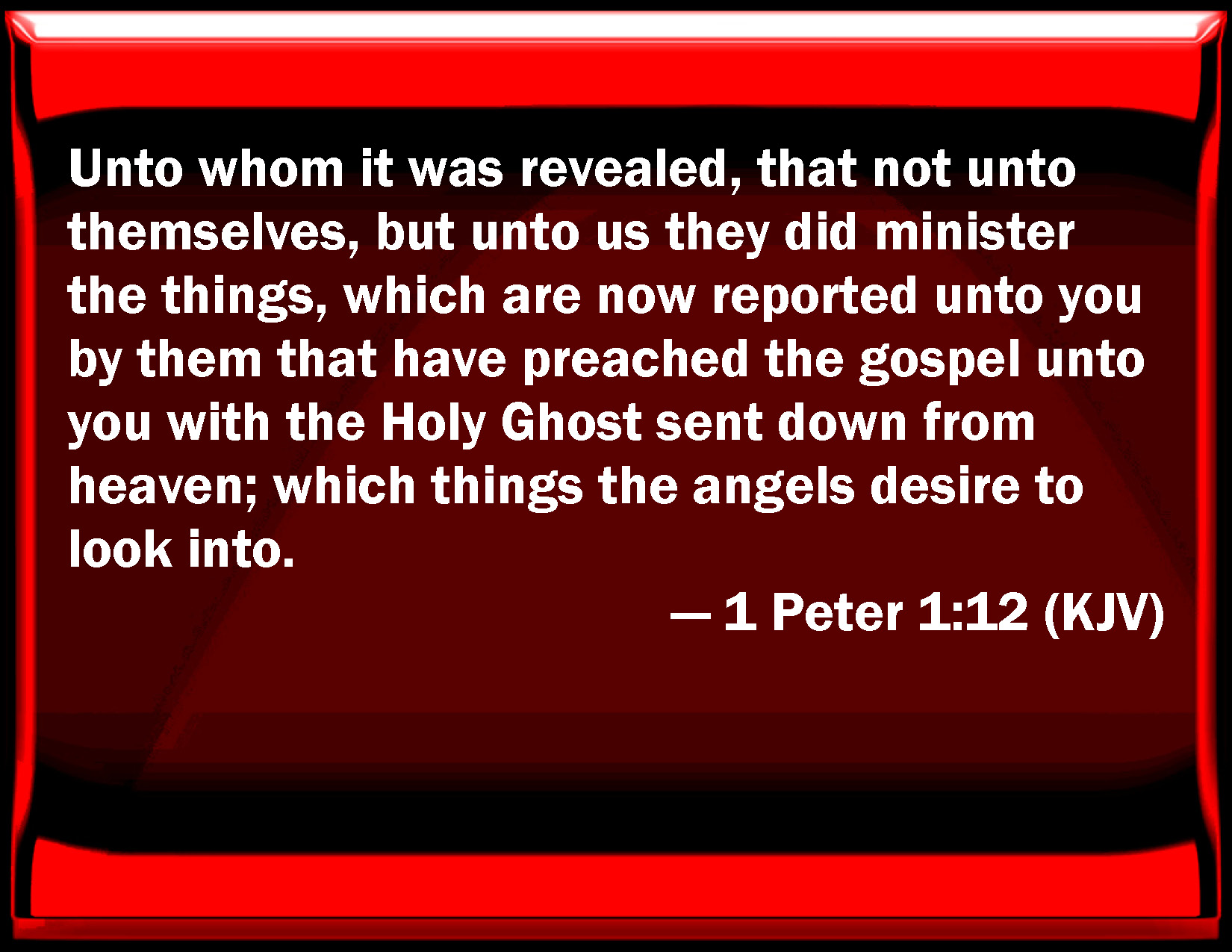 Bible Verse Slide 1 Peter 1:12 To whom it was revealed, that not to themselves, but to us they did minister the things, which are now reported to you by them that have preached the gospel to you with the Holy Ghost sent down from heaven; which things the angels desire to look into. KJV: Unto whom it was revealed, that not unto themselves, but unto us they did minister the things, which are now reported unto you by them that have preached the gospel unto you with the Holy Ghost sent down from heaven; which things the angels desire to look into. DRB: To whom it was revealed, that not to themselves, but to you they ministered those things which are now declared to you by them that have preached the gospel to you, the Holy Ghost being sent down from heaven, on whom the angels desire to look. DBT: To whom it was revealed, that not to themselves but to you they ministered those things, which have now been announced to you by those who have declared to you the glad tidings by the Holy Spirit, sent from heaven, which angels desire to look into. ERV: To whom it was revealed, that not unto themselves, but unto you, did they minister these things, which now have been announced unto you through them that preached the gospel unto you by the Holy Ghost sent forth from heaven; which things angels desire to look into. WBT: To whom it was revealed, that not to themselves, but to us they ministered the things which are now reported to you by them that have preached the gospel to you, with the Holy Spirit sent down from heaven; which things the angels desire to look into. WEB: To them it was revealed, that not to themselves, but to you, they ministered these things, which now have been announced to you through those who preached the Good News to you by the Holy Spirit sent out from heaven; which things angels desire to look into. YLT: to whom it was revealed, that not to themselves, but to us they were ministering these, which now were told to you (through those who did proclaim good news to you,) in the Holy Spirit sent from heaven, to which things messengers do desire to bend looking.Links 1 Peter 1:12 NIV • 1 Peter 1:12 NLT • 1 Peter 1:12 ESV • 1 Peter 1:12 NASB • 1 Peter 1:12 KJV • 1 Peter 1:12 Interlinear • 1 Peter 1:12 Commentaries • 1 Peter 1:12 Parallel Texts • 1 Peter 1:12 Bible Apps • 1 Peter 1:12 Parallel • Bible Hub |