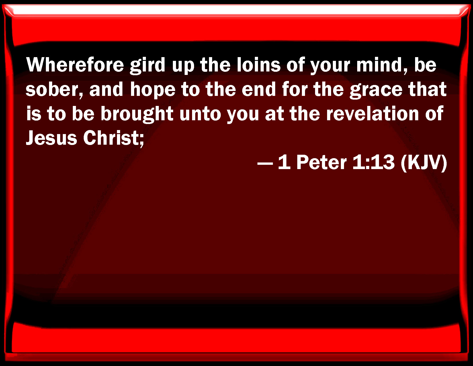 Bible Verse Slide 1 Peter 1:13 Why gird up the loins of your mind, be sober, and hope to the end for the grace that is to be brought to you at the revelation of Jesus Christ; KJV: Wherefore gird up the loins of your mind, be sober, and hope to the end for the grace that is to be brought unto you at the revelation of Jesus Christ; DRB: Wherefore having the loins of your mind girt up, being sober, trust perfectly in the grace which is offered you in the revelation of Jesus Christ, DBT: Wherefore, having girded up the loins of your mind, be sober and hope with perfect stedfastness in the grace which will be brought to you at the revelation of Jesus Christ; ERV: Wherefore girding up the loins of your mind, be sober and set your hope perfectly on the grace that is to be brought unto you at the revelation of Jesus Christ; WBT: Wherefore gird up the loins of your mind, be sober, and hope to the end for the grace that is to be brought to you at the revelation of Jesus Christ; WEB: Therefore, prepare your minds for action, be sober and set your hope fully on the grace that will be brought to you at the revelation of Jesus Christ— YLT: Wherefore having girded up the loins of your mind, being sober, hope perfectly upon the grace that is being brought to you in the revelation of Jesus Christ,Links 1 Peter 1:13 NIV • 1 Peter 1:13 NLT • 1 Peter 1:13 ESV • 1 Peter 1:13 NASB • 1 Peter 1:13 KJV • 1 Peter 1:13 Interlinear • 1 Peter 1:13 Commentaries • 1 Peter 1:13 Parallel Texts • 1 Peter 1:13 Bible Apps • 1 Peter 1:13 Parallel • Bible Hub |