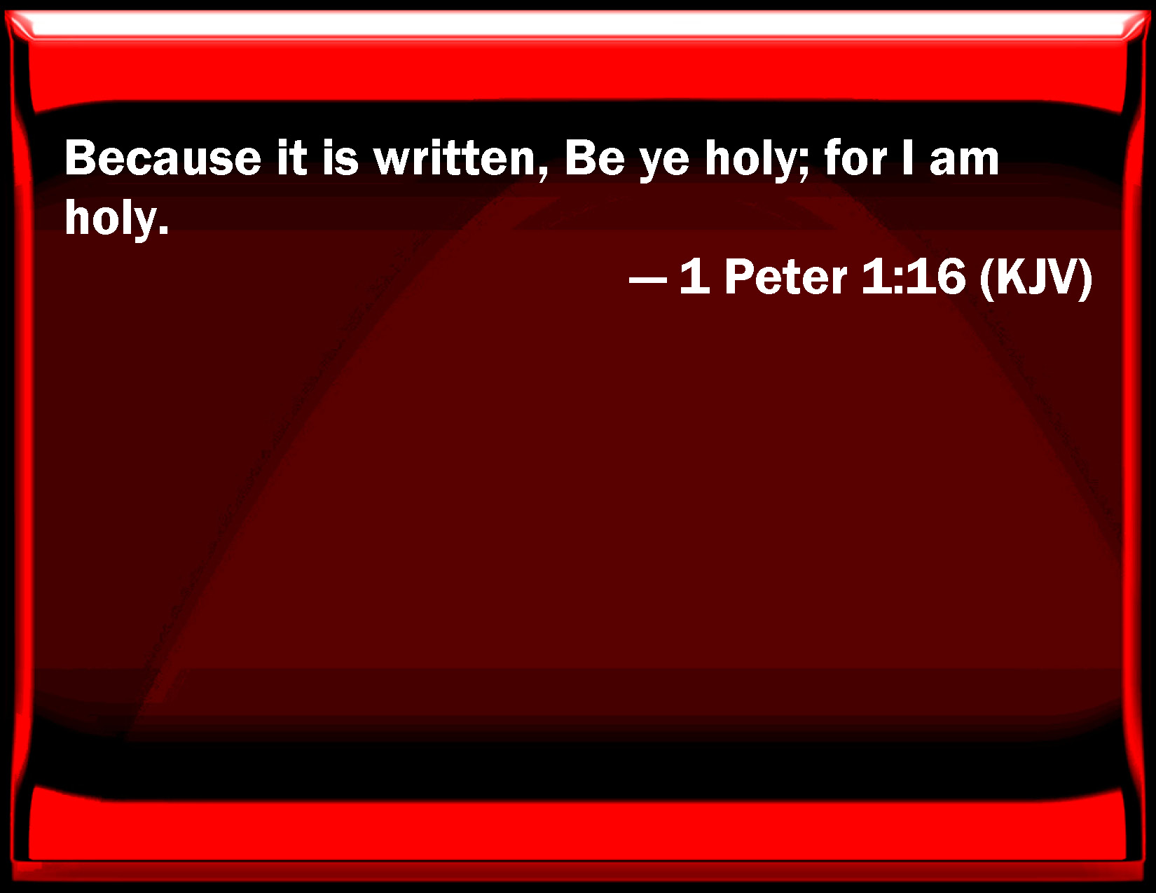 Bible Verse Slide 1 Peter 1:16 Because it is written, Be you holy; for I am holy. KJV: Because it is written, Be ye holy; for I am holy. DRB: Because it is written: You shall be holy, for I am holy. DBT: because it is written, Be ye holy, for I am holy. ERV: because it is written, Ye shall be holy; for I am holy. WBT: Because it is written, Be ye holy; for I am holy. WEB: because it is written, "You shall be holy; for I am holy." YLT: because it hath been written, 'Become ye holy, because I am holy;'Links 1 Peter 1:16 NIV • 1 Peter 1:16 NLT • 1 Peter 1:16 ESV • 1 Peter 1:16 NASB • 1 Peter 1:16 KJV • 1 Peter 1:16 Interlinear • 1 Peter 1:16 Commentaries • 1 Peter 1:16 Parallel Texts • 1 Peter 1:16 Bible Apps • 1 Peter 1:16 Parallel • Bible Hub |