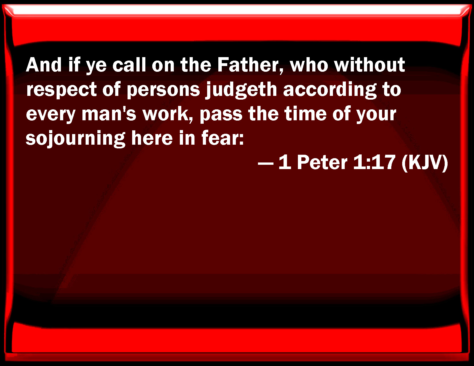 Bible Verse Slide 1 Peter 1:17 And if you call on the Father, who without respect of persons judges according to every man's work, pass the time of your sojourning here in fear: KJV: And if ye call on the Father, who without respect of persons judgeth according to every man's work, pass the time of your sojourning here in fear: DRB: And if you invoke as Father him who, without respect of persons, judgeth according to every one's work: converse in fear during the time of your sojourning here. DBT: And if ye invoke as Father him who, without regard of persons, judges according to the work of each, pass your time of sojourn in fear, ERV: And if ye call on him as Father, who without respect of persons judgeth according to each man's work, pass the time of your sojourning in fear: WBT: And if ye call on the Father, who without respect of persons judgeth according to every man's work, pass the time of your sojourning here in fear: WEB: If you call on him as Father, who without respect of persons judges according to each man's work, pass the time of your living as foreigners here in reverent fear: YLT: and if on the Father ye do call, who without acceptance of persons is judging according to the work of each, in fear the time of your sojourn pass ye,Links 1 Peter 1:17 NIV • 1 Peter 1:17 NLT • 1 Peter 1:17 ESV • 1 Peter 1:17 NASB • 1 Peter 1:17 KJV • 1 Peter 1:17 Interlinear • 1 Peter 1:17 Commentaries • 1 Peter 1:17 Parallel Texts • 1 Peter 1:17 Bible Apps • 1 Peter 1:17 Parallel • Bible Hub |