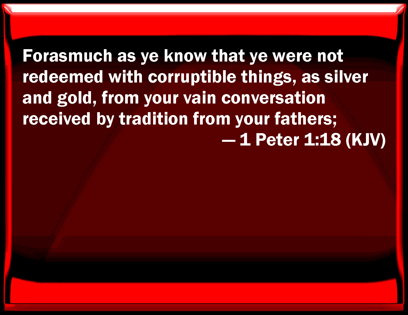 Bible Verse Slide 1 Peter 1:18 For as much as you know that you were not redeemed with corruptible things, as silver and gold, from your vain conversation received by tradition from your fathers; KJV: Forasmuch as ye know that ye were not redeemed with corruptible things, as silver and gold, from your vain conversation received by tradition from your fathers; DRB: Knowing that you were not redeemed with corruptible things as gold or silver, from your vain conversation of the tradition of your fathers: DBT: knowing that ye have been redeemed, not by corruptible things, as silver or gold, from your vain conversation handed down from your fathers, ERV: knowing that ye were redeemed, not with corruptible things, with silver or gold, from your vain manner of life handed down from your fathers; WBT: Forasmuch as ye know that ye were not redeemed with corruptible things, as silver and gold, from your vain course of life received by tradition from your fathers; WEB: knowing that you were redeemed, not with corruptible things, with silver or gold, from the useless way of life handed down from your fathers, YLT: having known that, not with corruptible things — silver or gold — were ye redeemed from your foolish behaviour delivered by fathers,Links 1 Peter 1:18 NIV • 1 Peter 1:18 NLT • 1 Peter 1:18 ESV • 1 Peter 1:18 NASB • 1 Peter 1:18 KJV • 1 Peter 1:18 Interlinear • 1 Peter 1:18 Commentaries • 1 Peter 1:18 Parallel Texts • 1 Peter 1:18 Bible Apps • 1 Peter 1:18 Parallel • Bible Hub |